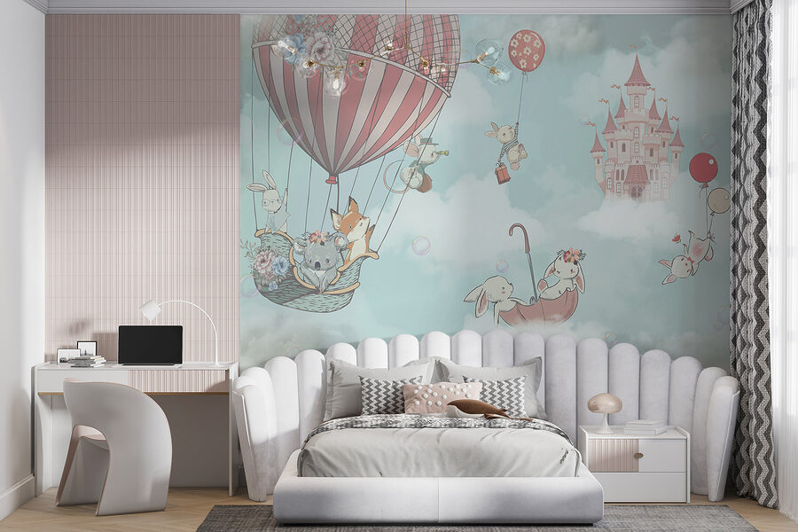 Os mais pequenos vão adorar ver os pormenores encantadores – um coala com uma coroa de flores, coelhinhos com balões, todos a flutuar entre nuvens fofas com um castelo de sonho como pano de fundo. Todo o cenário é positivamente encantador, como se pudessem saltar para o seu próprio conto de fadas assim que acordassem.