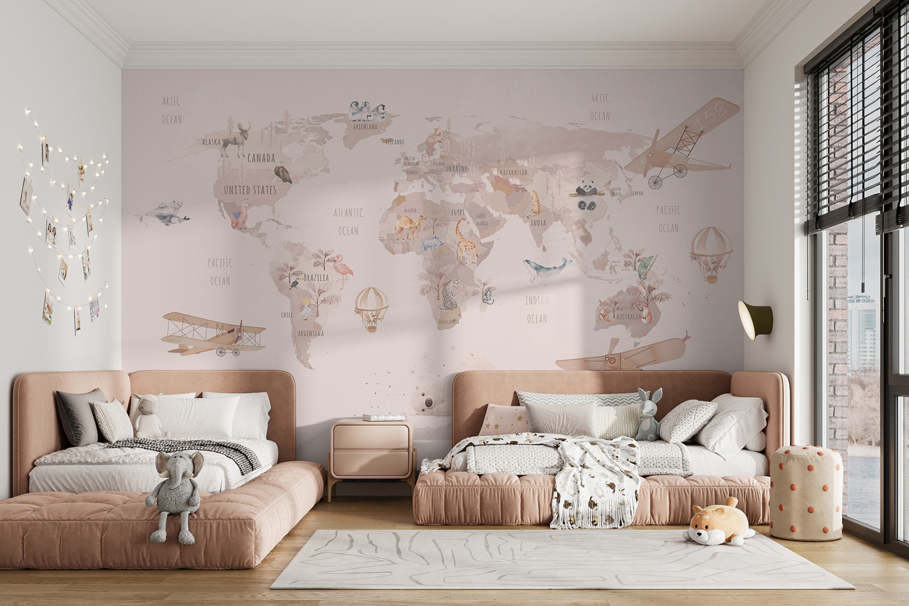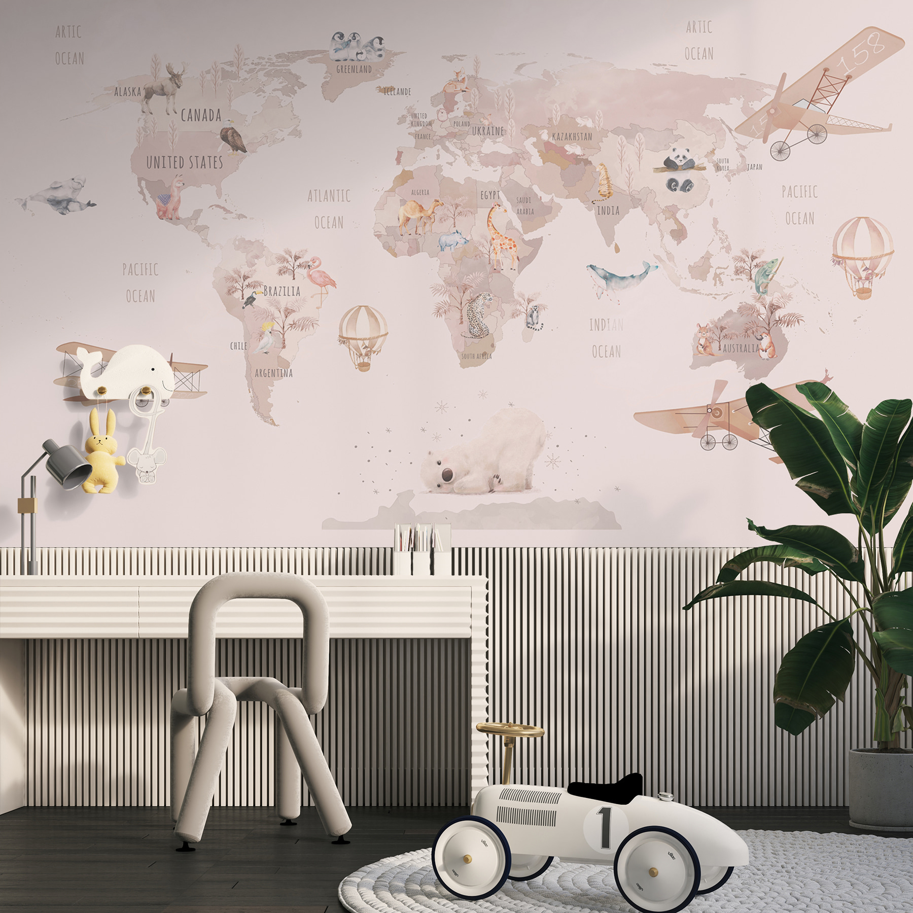 Transforme qualquer divisão numa viagem extravagante à volta do globo com este mural de parede encantador, “Map of the World”. É como uma carta de amor à aventura, com ilustrações encantadoras de animais e aviões divertidos, despertando instantaneamente a curiosidade e o desejo de viajar. Imagine os mais pequenos a apontar os seus países favoritos ou a sonhar com terras exóticas enquanto estão rodeados por estes desenhos encantadores. Com cores suaves e elementos lúdicos, transforma as paredes numa tela de imaginação – perfeita para infantários ou salas de jogos. Este mural não se limita a decorar; convida a histórias e sonhos. Por isso, vamos lá explorar!