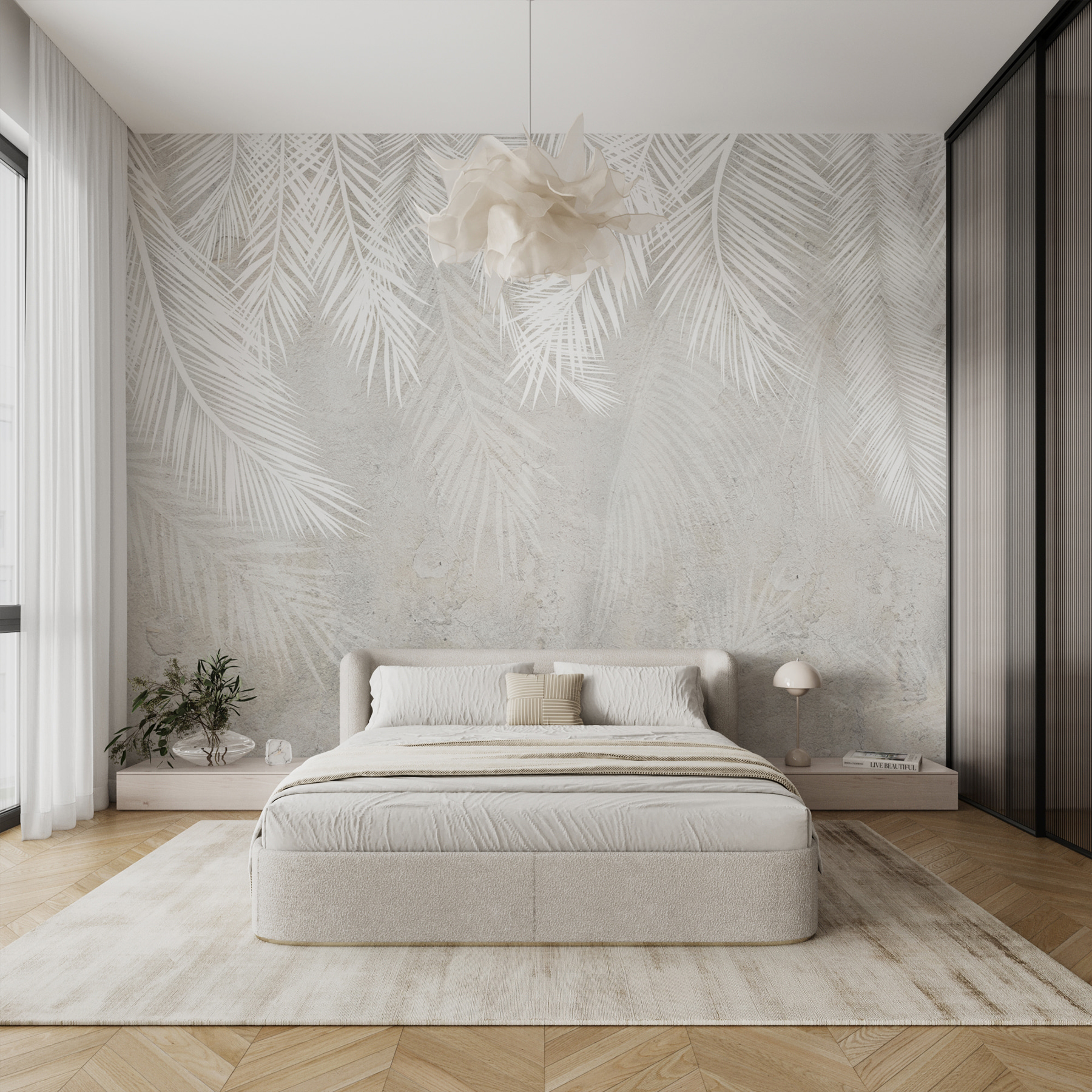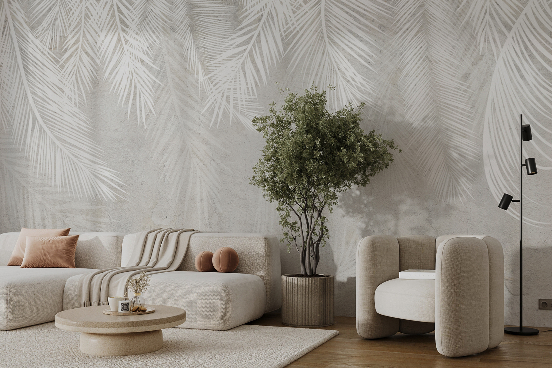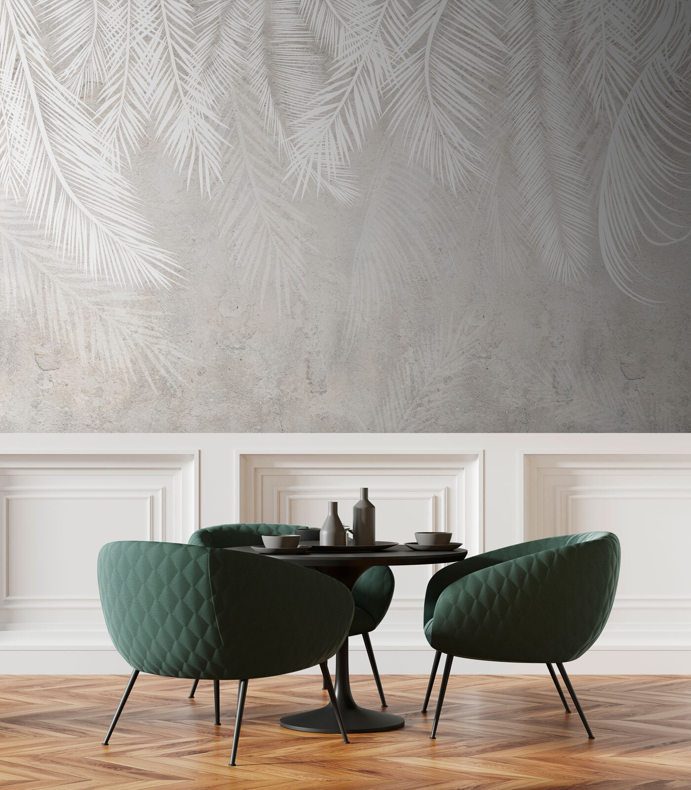 Transforme qualquer divisão com este cativante mural de parede com folhas brancas num suave fundo cinzento. É como trazer uma floresta tranquila para o seu espaço, sem os insectos e os ramos no seu cabelo. Imagine tomar um café numa sala luminosa e arejada com este design chique – acrescenta uma vibração calmante, perfeita para aqueles momentos em que a vida parece um pouco agitada demais. E quem é que não gostaria que as suas paredes sussurrassem palavras doces sobre a natureza? Este mural prepara o cenário para serões acolhedores ou encontros vibrantes. É simples, marcante e definitivamente um início de conversa!
