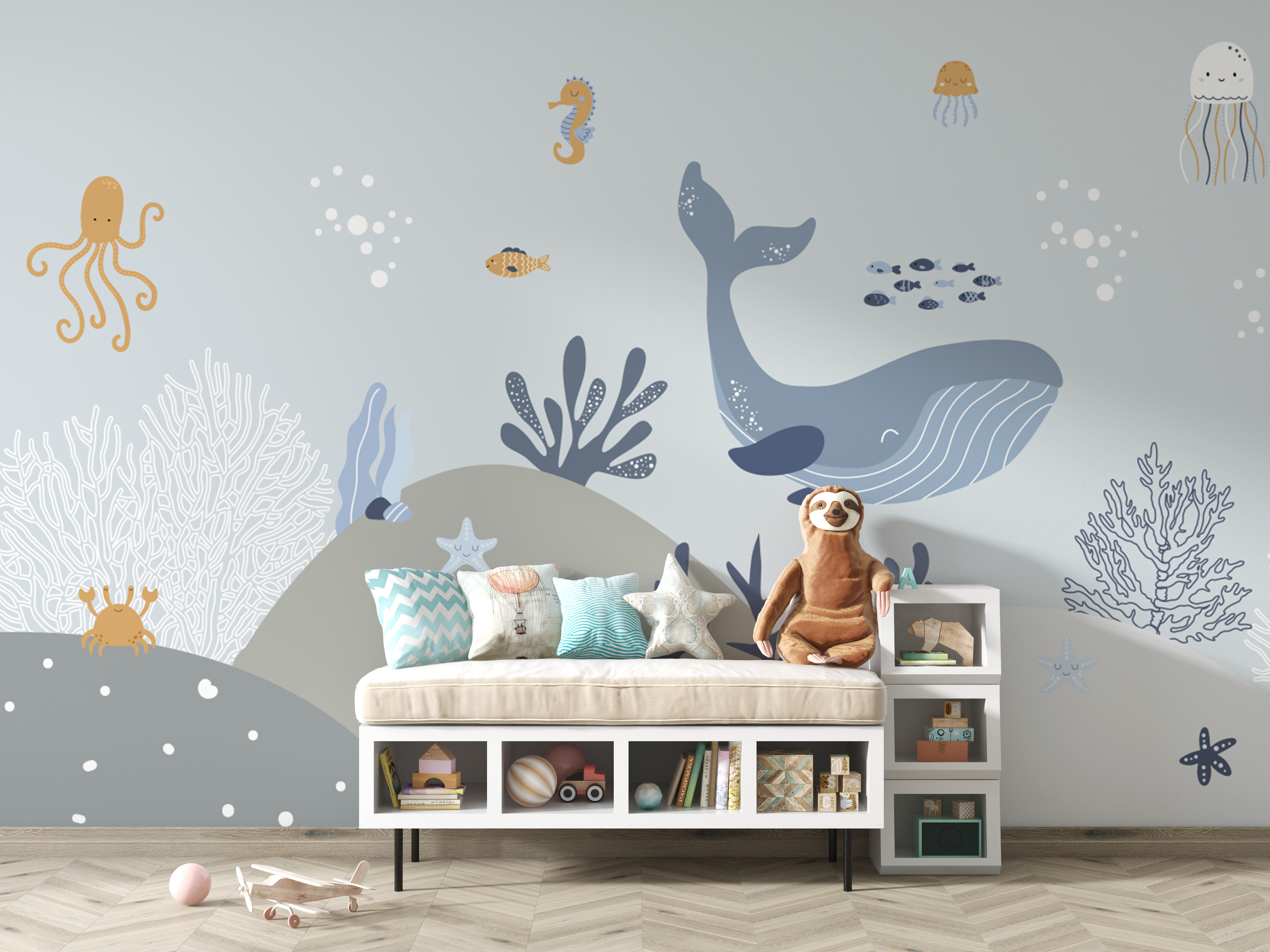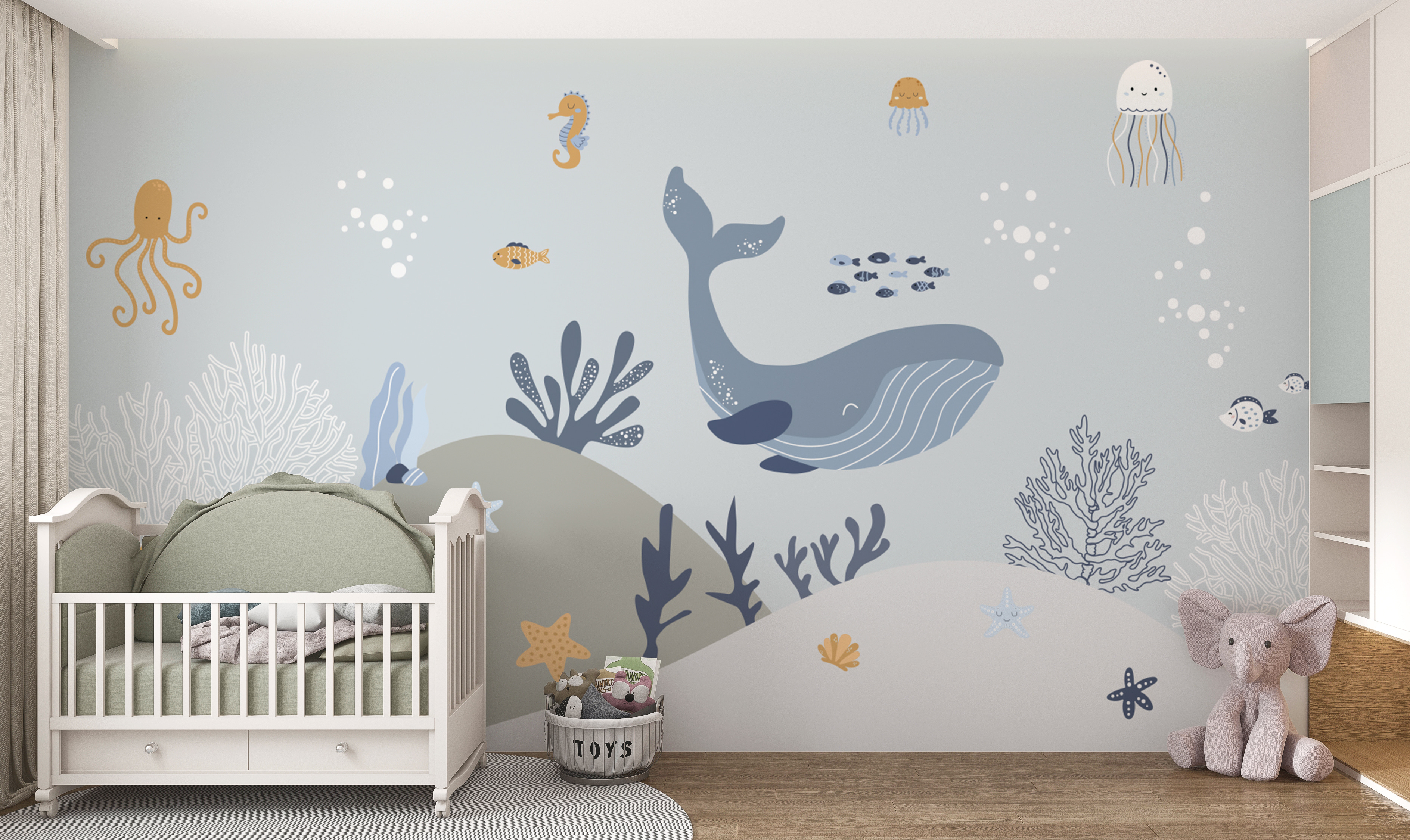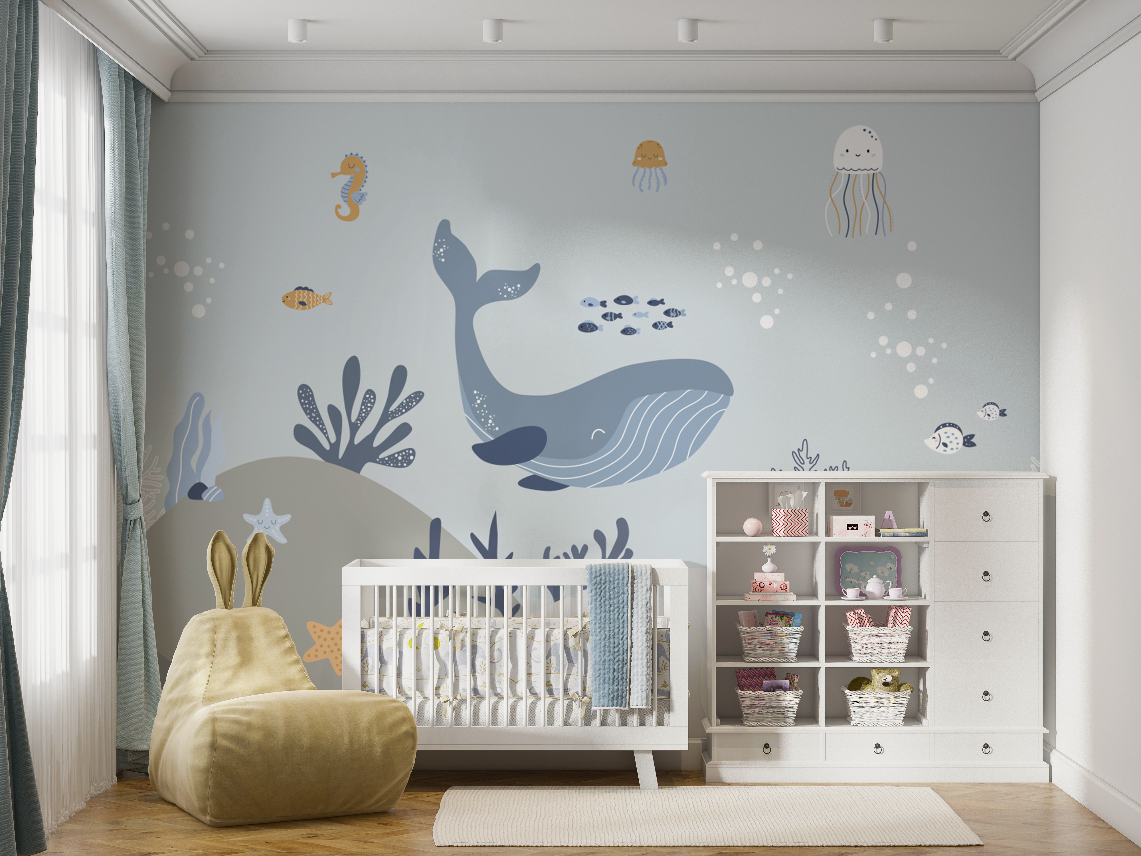 Adicionar este mural pode tornar as histórias de embalar sobre amigos subaquáticos ainda mais emocionantes. O adorável polvo, as baleias e as estrelas-do-mar quase parecem ganhar vida, convidando as crianças para inúmeras aventuras imaginativas. Além disso, as cores suaves e as criaturas simpáticas são o cenário perfeito para a hora da sesta e para brincar.