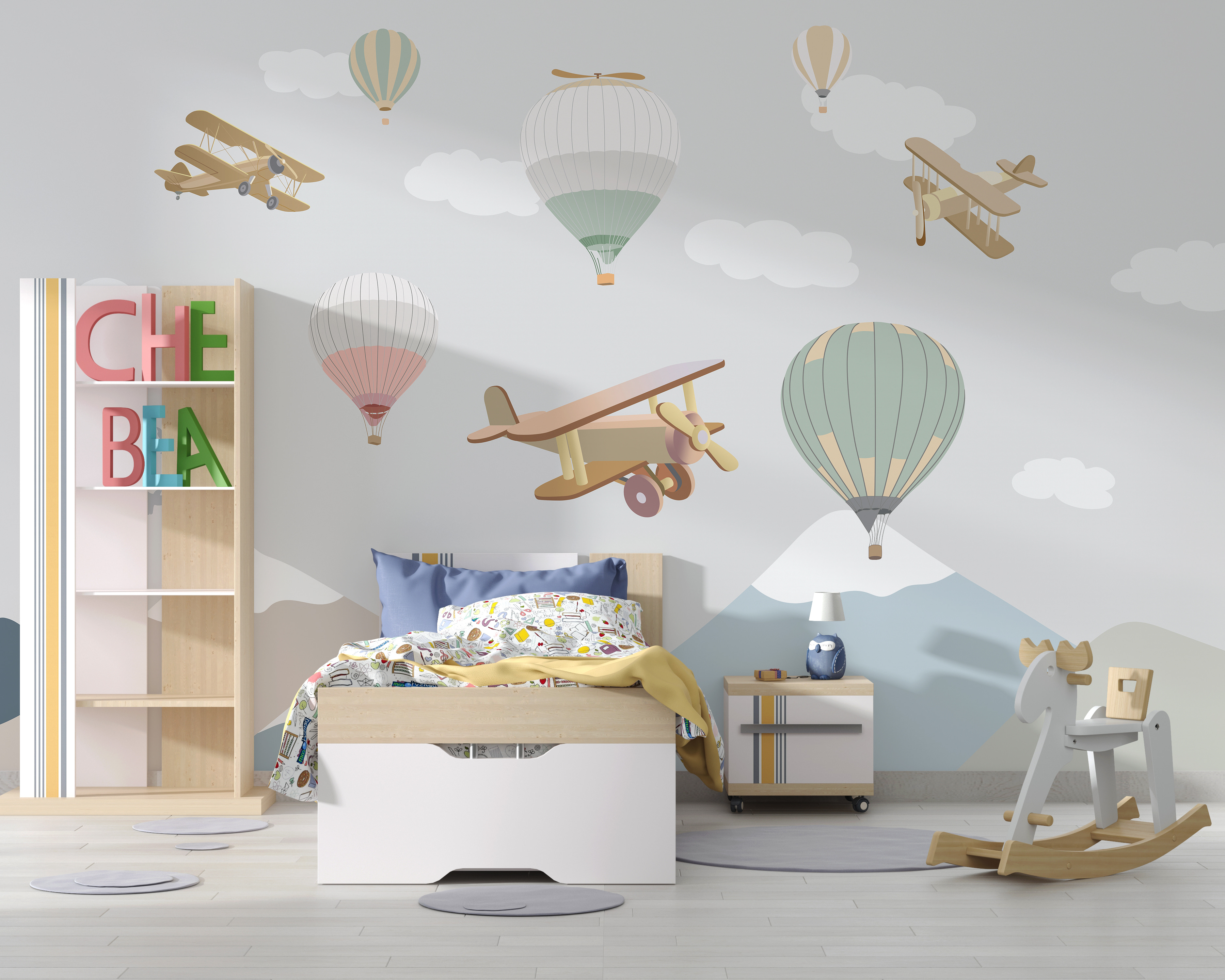 Tem um aventureiro selvagem na família? O mural de parede “Hot Air Balloon in the Sky” é como abrir uma janela para uma terra de sonho extravagante. Perfeito para infantários e quartos de pequenos exploradores, este mural apresenta balões de ar quente em tons pastel suaves e aviões antigos contra nuvens suaves e fofas – sobrevoando montanhas serenas. Imagine aquelas pequenas gargalhadas enquanto o seu filho adormece, sonhando com aventuras de voo! É calmante mas excitante, despertando a imaginação e mantendo as coisas muito divertidas. Sonhos agradáveis garantidos!