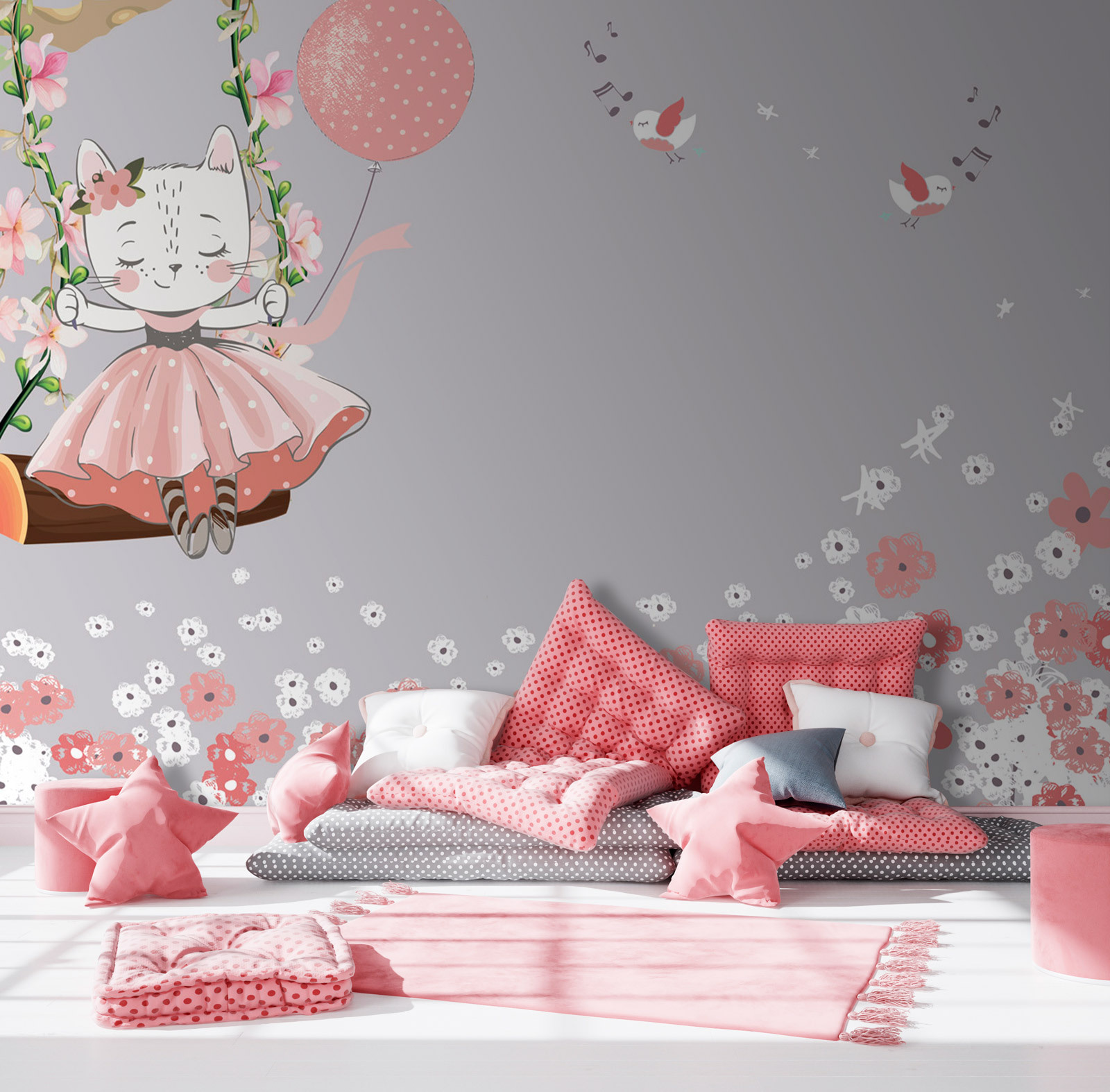 Imagine entrar num quarto e ser recebido pelo capricho de “White Bird with Pink Wings” – é como uma brisa suave de alegria! Este mural enquadra-se perfeitamente em qualquer quarto de criança, quer seja um berçário ou uma sala de jogos, com tons pastel suaves e pássaros brincalhões que parecem cantar. Imagine só: um cenário sereno para histórias de embalar ou para brincadeiras à tarde. Os tons suaves de rosa e branco dão um toque de magia, fazendo com que o espaço se sinta arejado e leve. Tem o encanto de um livro de histórias, perfeito para despertar a imaginação dos mais pequenos. Além disso, é tão giro que pode dar por si a sonhar acordado ao lado daqueles pássaros alegres!