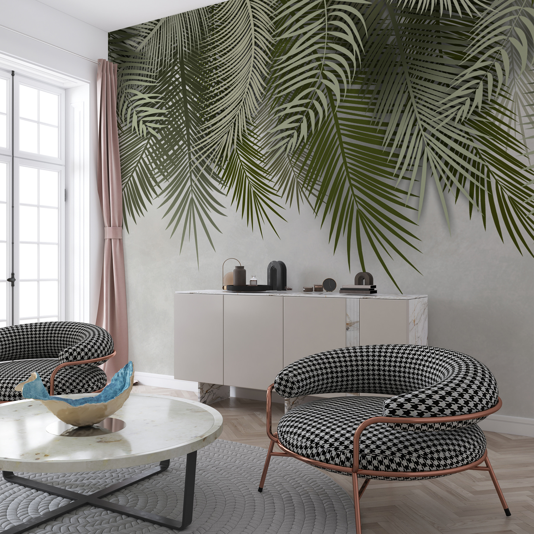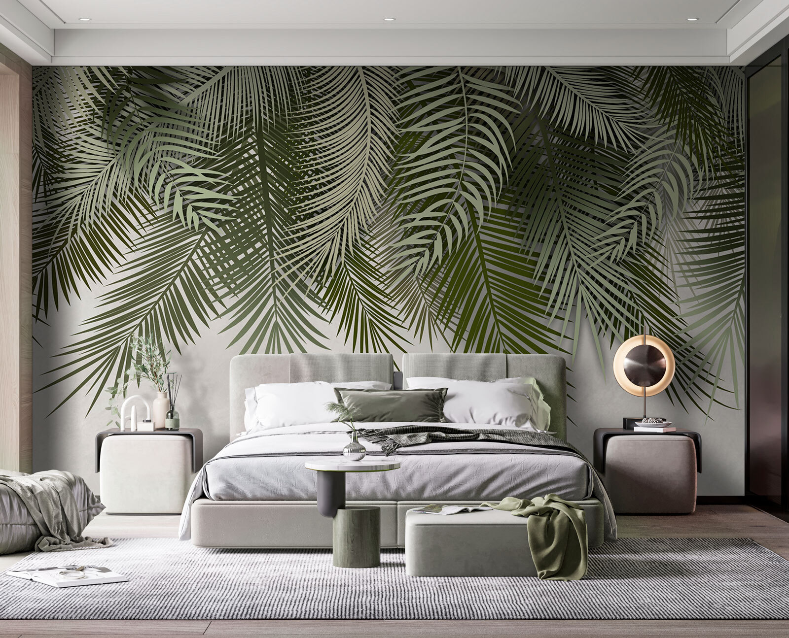 O mural parece vivo, mas não é avassalador. É apenas o suficiente para o fazer pensar em dias quentes e arejados sem ter de se preocupar com a rega das plantas. Combina bem com designs minimalistas ou pode ser usado com uma decoração vibrante e tropical – super versátil! Este design respira vida e frescura, fazendo-nos sentir como se estivéssemos deitados debaixo de um dossel, a olhar para o céu. Não é fixe?