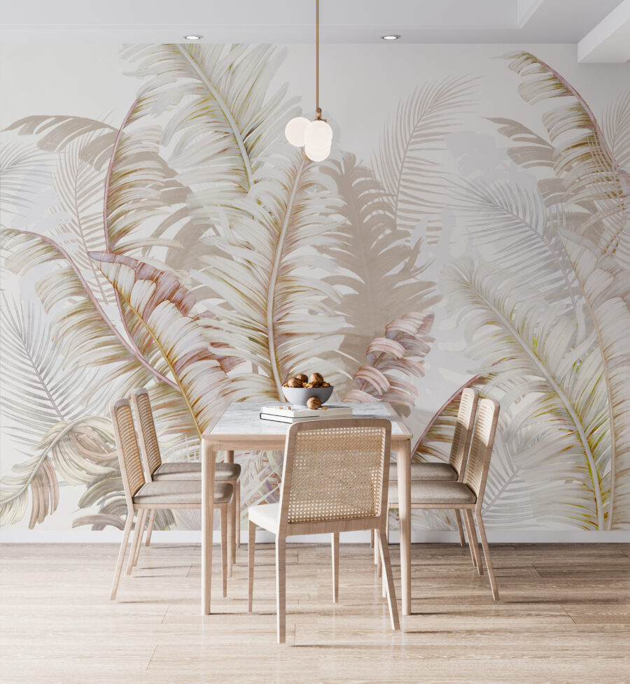 Imagine-se sentado no seu lugar preferido em casa, rodeado pela beleza serena da natureza, sem sequer sair de casa. O mural de parede “Tropical Leaves in Gentle Hues” leva-o até lá. Os tons suaves e discretos das folhas tropicais criam um oásis de calma, perfeito para qualquer divisão que precise de um toque de tranquilidade. Não é apenas papel de parede; é como um sussurro suave da floresta. Não consegue sentir a brisa a passar pelas folhas? Instale este mural de designer e transforme o seu espaço num retiro tranquilo – o seu próprio pequeno pedaço de paraíso.