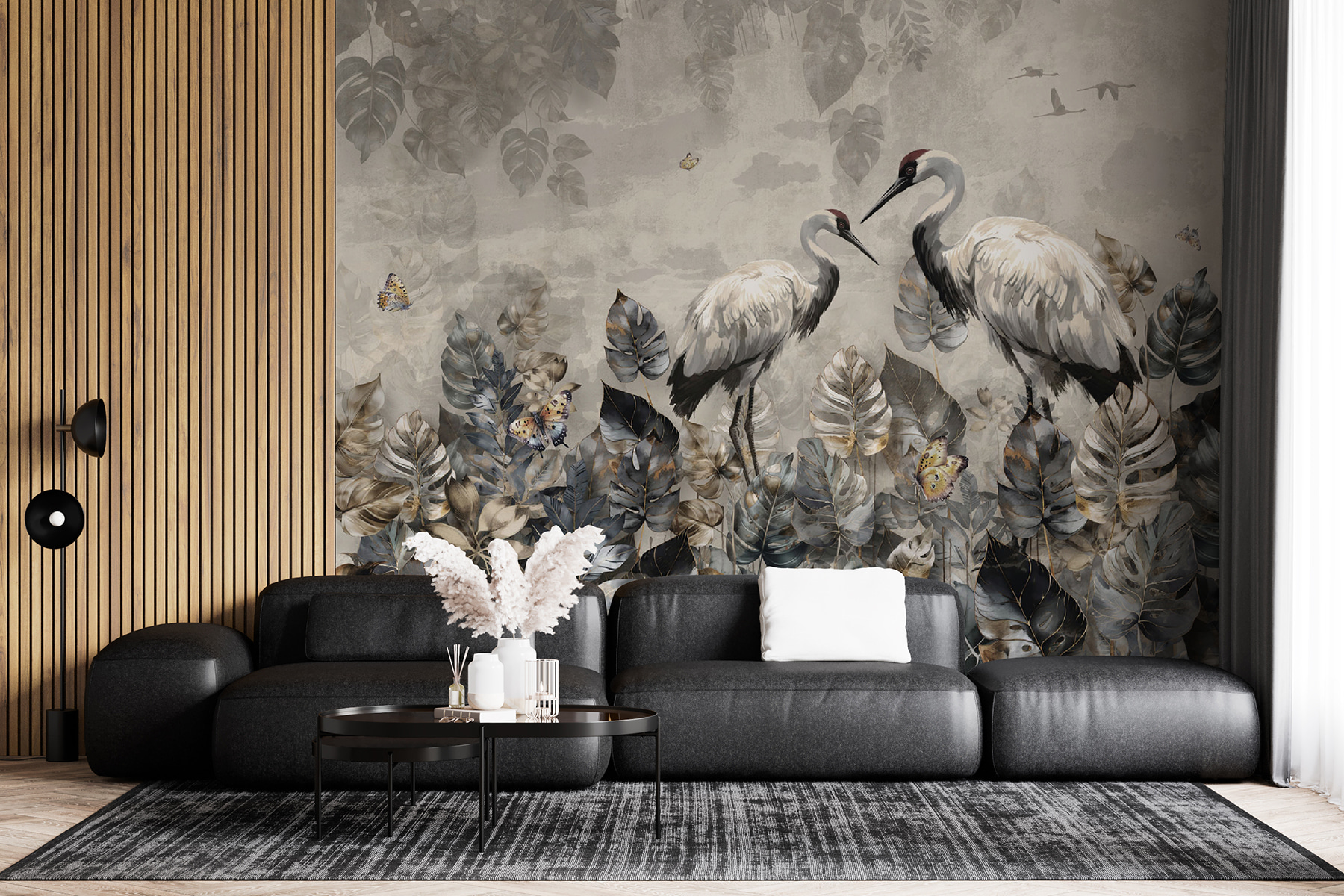 Imagine acordar, espreguiçar-se e mergulhar na visão serena de dois grous, um deles a segurar um peixe, mesmo ali na sua parede. Este mural é mais do que uma simples decoração; é como ter uma fatia da poesia da natureza dentro de casa. Dança entre azuis temperamentais e cinzentos terrosos, com aquelas borboletas a esvoaçar à volta de folhas que parecem ter sido beijadas pelo fim do outono.