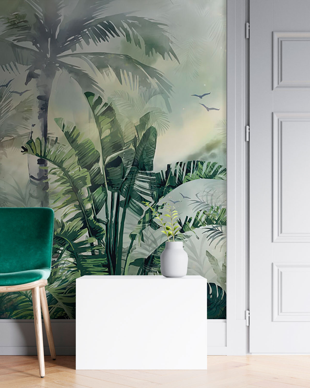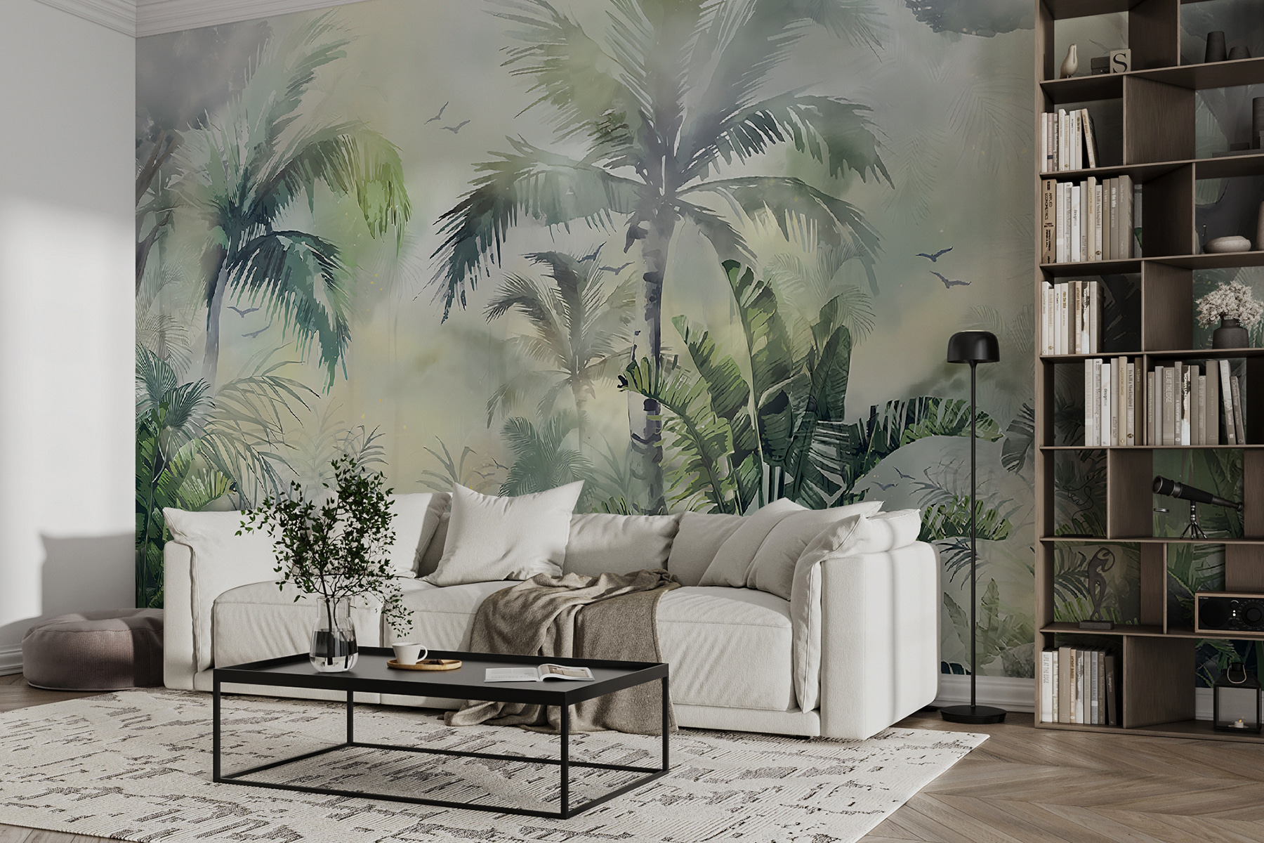 Transforme qualquer divisão num paraíso exuberante com este deslumbrante mural de uma selva enevoada. Imagine-se a passear por entre a folhagem densa, a respirar ar fresco – ah, a serenidade! É como ter umas mini-férias em casa, mas sem o stress da viagem. Os verdes suaves e as suaves nuvens de névoa convidam a vibrações calmas, perfeitas para um recanto de leitura acolhedor ou para uma fuga serena do quarto. Além disso, quem não gostaria de se sentir como se estivesse a beber uma bebida numa escapadela tropical todos os dias? Prepare-se para abraçar a aventura da natureza, tudo a partir do conforto do seu sofá.