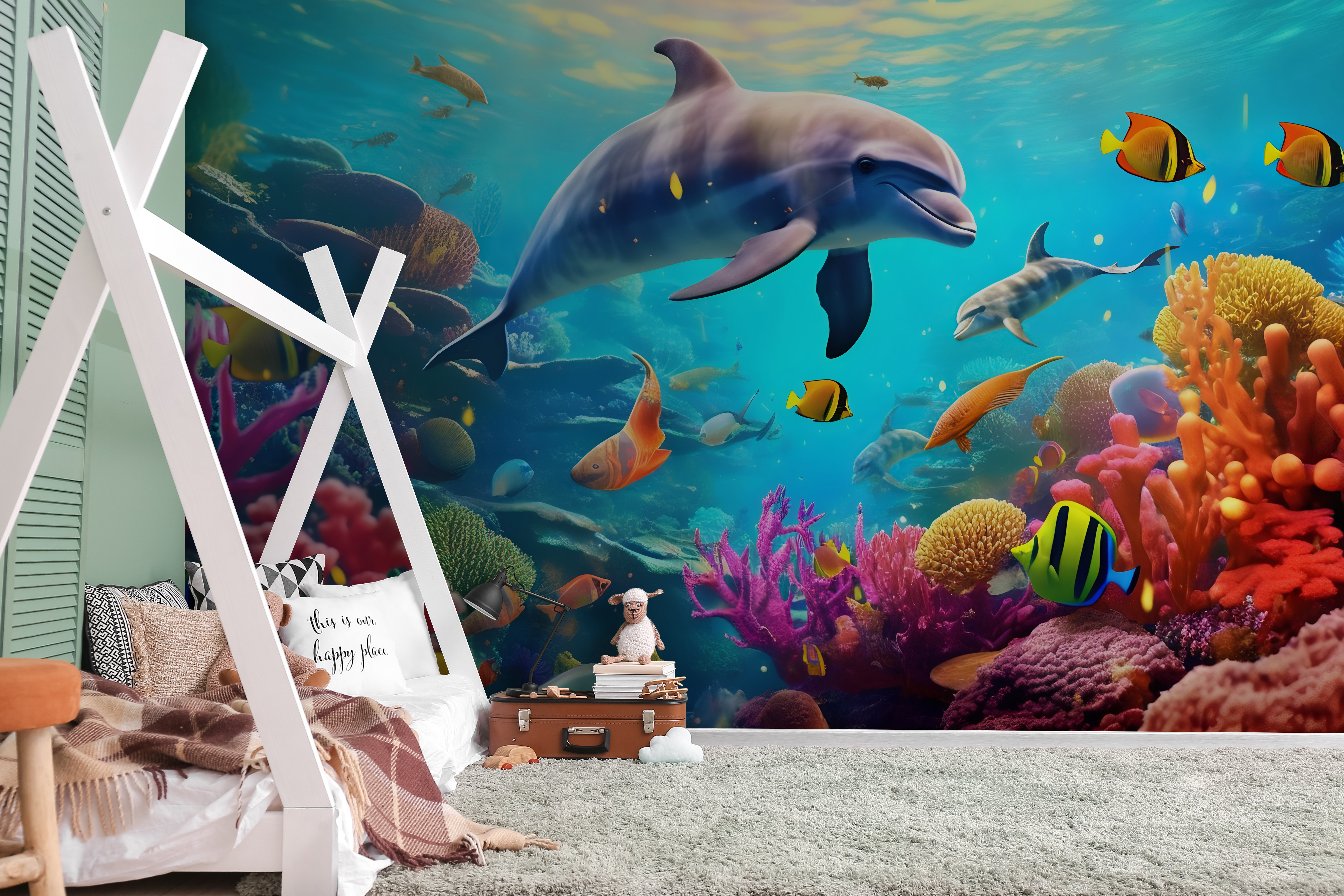 Mergulhe num mundo de cor e alegria com este cativante mural com golfinhos a deslizar por um vibrante recife de coral. Perfeito para alegrar o quarto de uma criança ou para dar um toque de diversão a qualquer espaço, traz a maravilha do oceano diretamente para as suas paredes. Imagine os mais pequenos a sorrir enquanto exploram o cenário subaquático, repleto de peixes simpáticos e golfinhos brincalhões. Cada olhar parece uma mini-férias! As tonalidades dançam com a luz, criando uma atmosfera animada que desperta a imaginação e a aventura. Quem não gostaria de nadar com golfinhos nos seus sonhos?