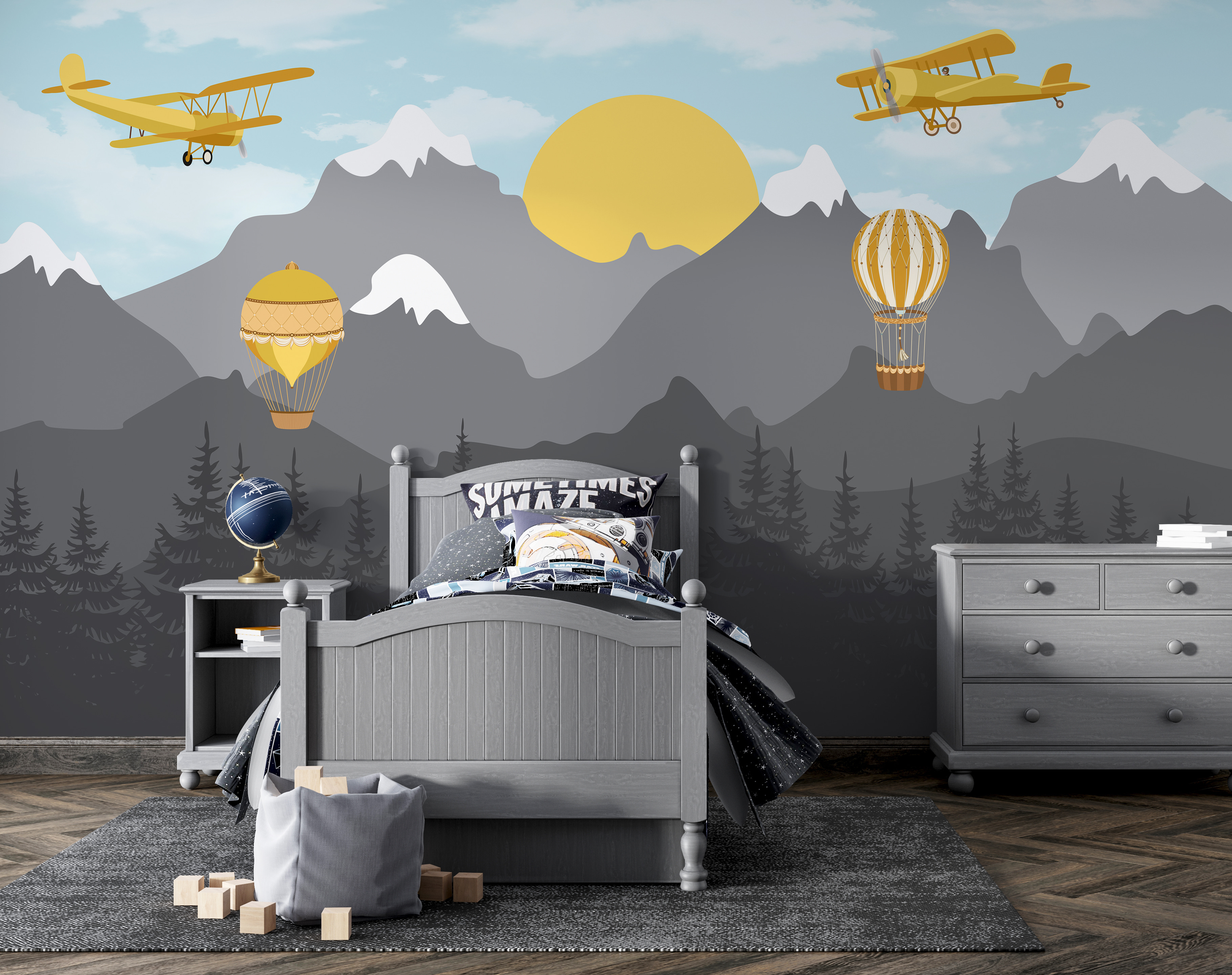 Transforme o quarto de uma criança numa aventura extravagante no céu com este mural encantador que apresenta um avião amarelo a voar sobre montanhas majestosas e balões de ar quente divertidos. Imagine a excitação dos mais pequenos a olhar para cima, sonhando com terras longínquas e com a emoção de voar. Os azuis suaves e os cinzentos suaves criam um cenário calmante, enquanto o amarelo alegre se destaca para chamar a atenção e despertar a alegria. Pendure-o num quarto ou numa área de lazer e veja a imaginação ganhar asas! É como ter um pedacinho do céu dentro de casa – mas talvez não com nuvens verdadeiras. Perfeito para espíritos aventureiros!