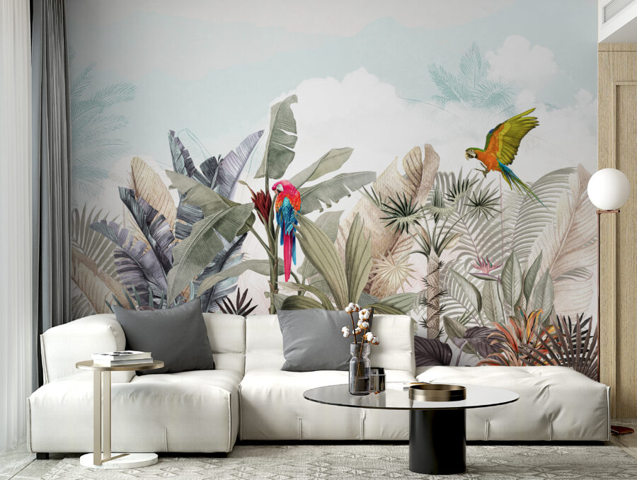 Conheça a sua nova obsessão de parede: o mural “Papagaio colorido a voar no ar”. É como encontrar o sonho de um observador de pássaros na sua sala de estar! Imagine dois papagaios vibrantes a planar sobre verdes folhosos e flores tropicais. É como umas mini-férias na floresta tropical – sem os mosquitos, graças a Deus!
