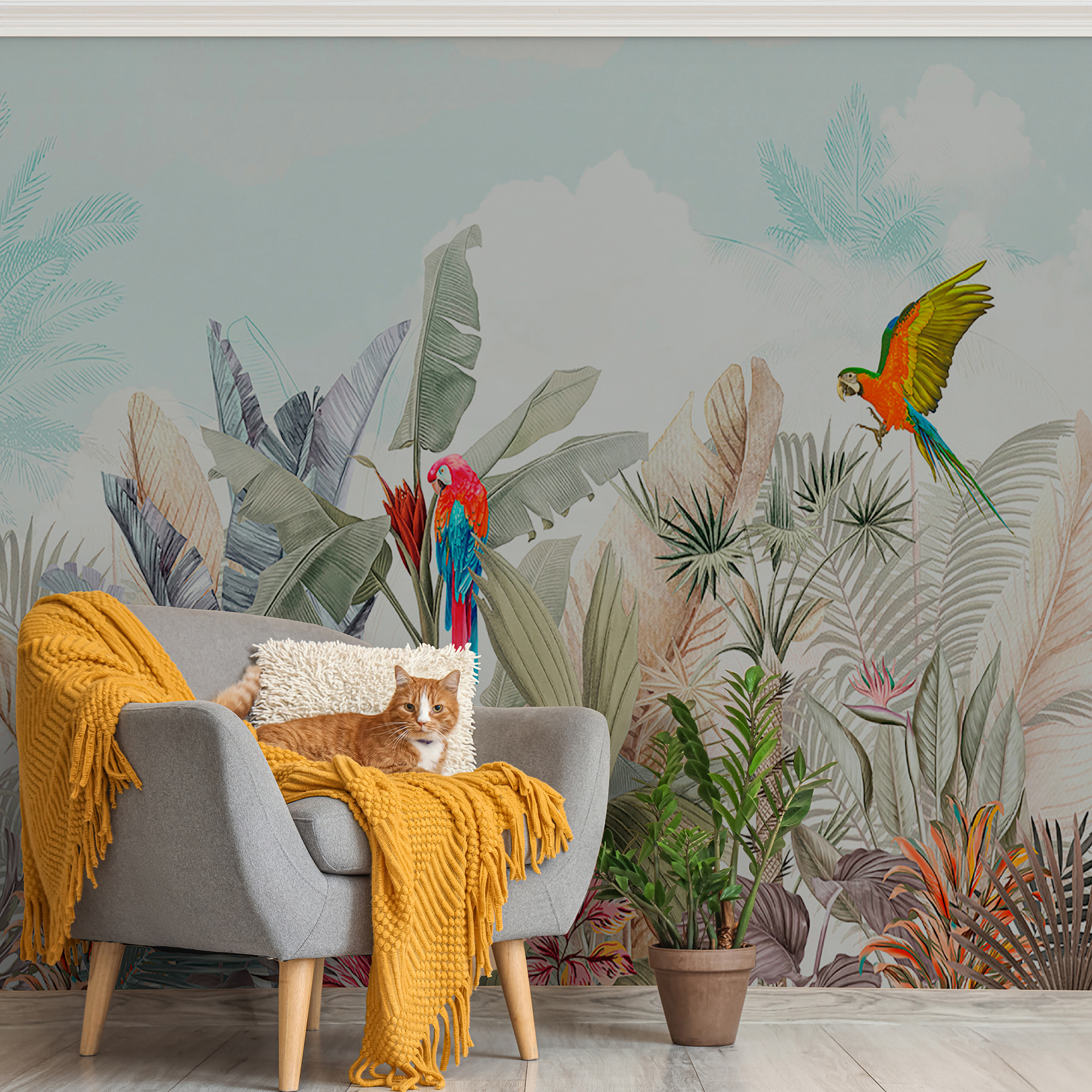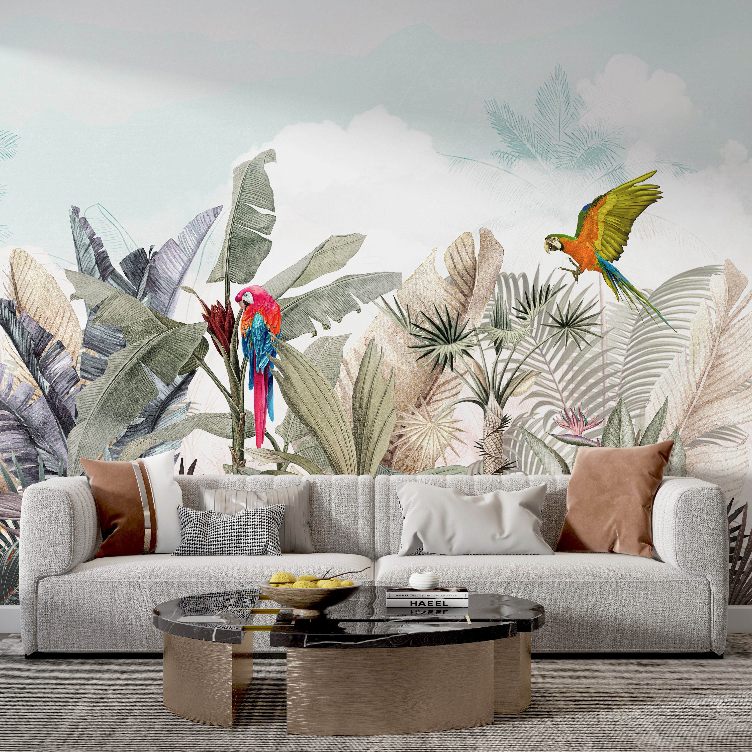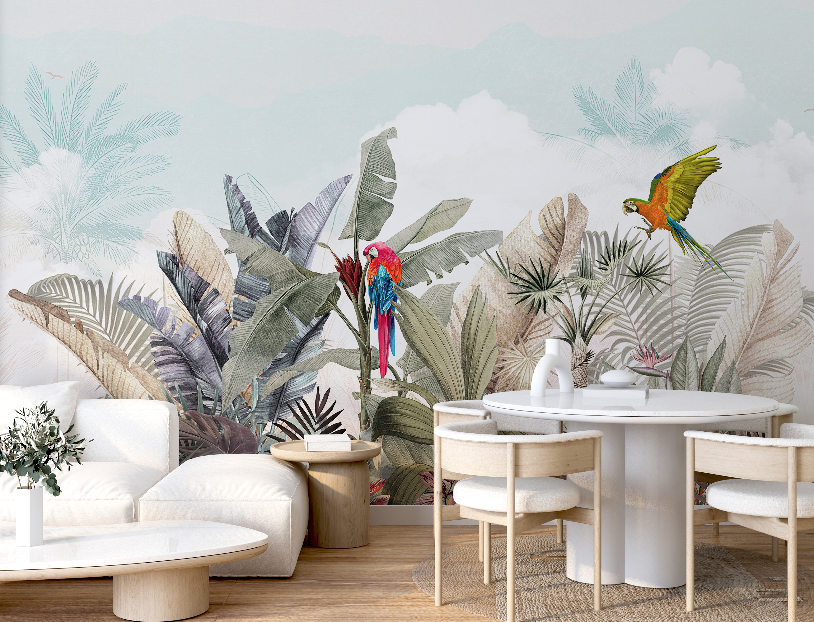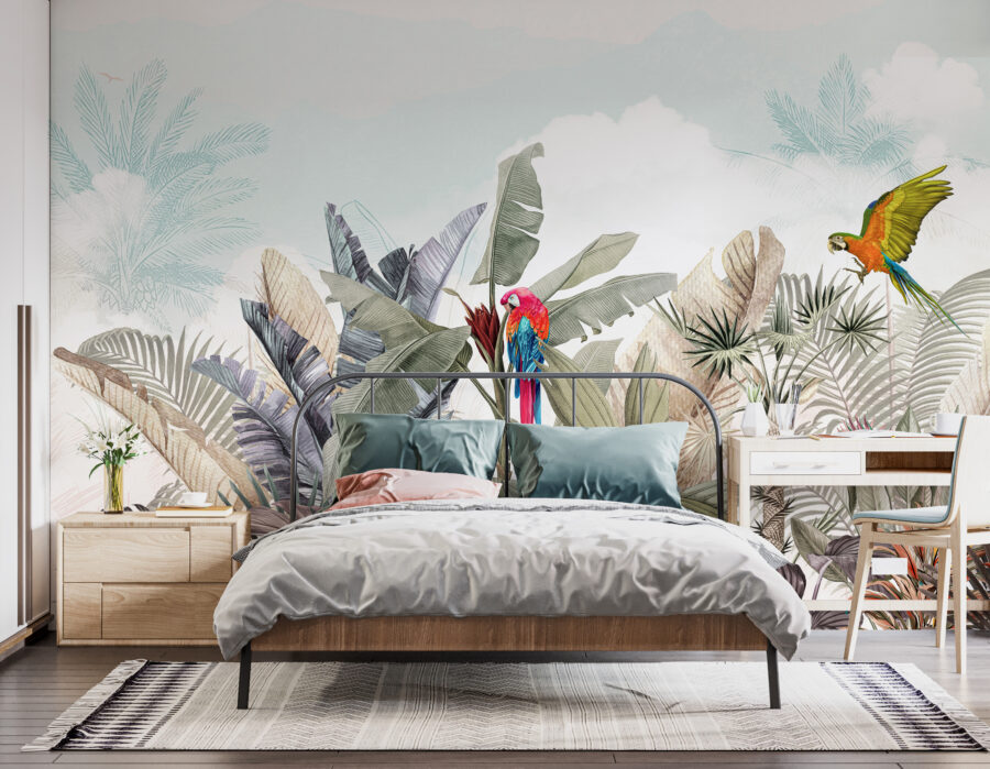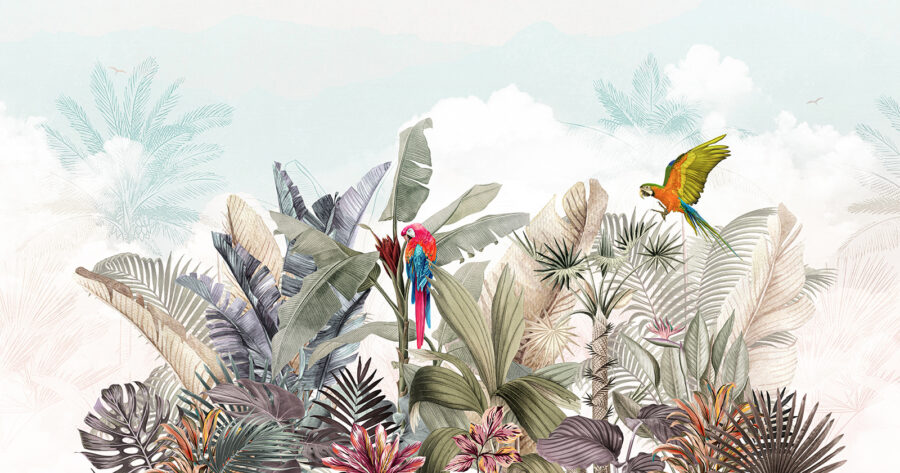 Conheça a sua nova obsessão de parede: o mural “Papagaio colorido a voar no ar”. É como encontrar o sonho de um observador de pássaros na sua sala de estar! Imagine dois papagaios vibrantes a planar sobre verdes folhosos e flores tropicais. É como umas mini-férias na floresta tropical – sem os mosquitos, graças a Deus!