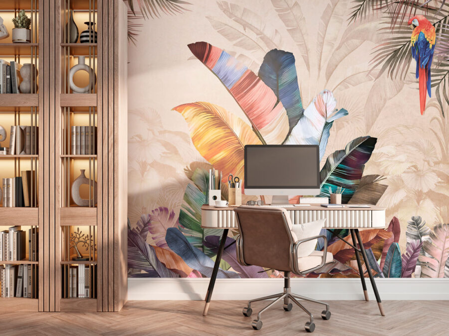 Transforme qualquer divisão numa fuga tropical com este mural vibrante da selva. Imagine-se a entrar num paraíso exuberante, onde as impressionantes folhas de palmeira dançam e um papagaio colorido vigia. É o cenário perfeito para tardes preguiçosas, conversas de café ou uma explosão de inspiração enquanto trabalha a partir de casa. A forma como as folhas se destacam contra o fundo suave faz com que se sinta como se fosse verão durante todo o ano. Os amigos vão pensar que alguém andou a viajar de avião, enquanto você se limita a sentar-se e a desfrutar do sol diário, sem as queimaduras solares. Quem não gostaria de se sentir tão próximo da natureza sem sair do sofá?