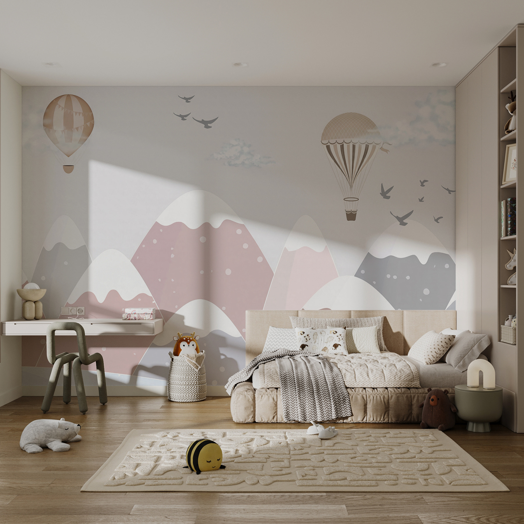Consegue imaginar histórias para adormecer debaixo deste mural? Contar histórias de viagens de balão de ar quente sobre as montanhas. Tem este aspeto clássico e intemporal, mas com um toque suave e moderno. Está mesmo ali naqueles ‘Murais de Parede Populares’ por uma razão, sabe. Ilumina o espaço com charme e calor.