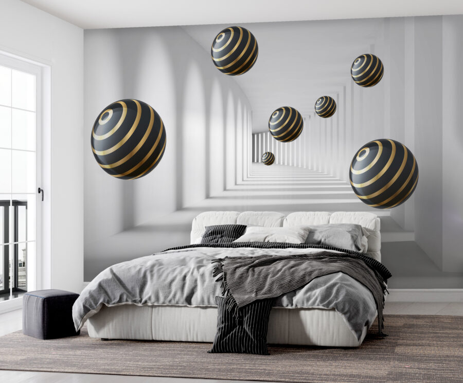 Imagine entrar numa sala e sentir que está a entrar diretamente noutra dimensão. É exatamente isso que o “Mural de Parede Esferas Riscadas Pairam no Corredor Branco” faz. É este design moderno, quase hipnótico, que nos faz sentir como se estivéssemos num túnel futurista. As esferas, com as suas riscas elegantes, parecem flutuar sem esforço, criando uma sensação de profundidade que pode realmente fazer com que o seu espaço pareça maior. É como ter o seu próprio filme de ficção científica na parede!