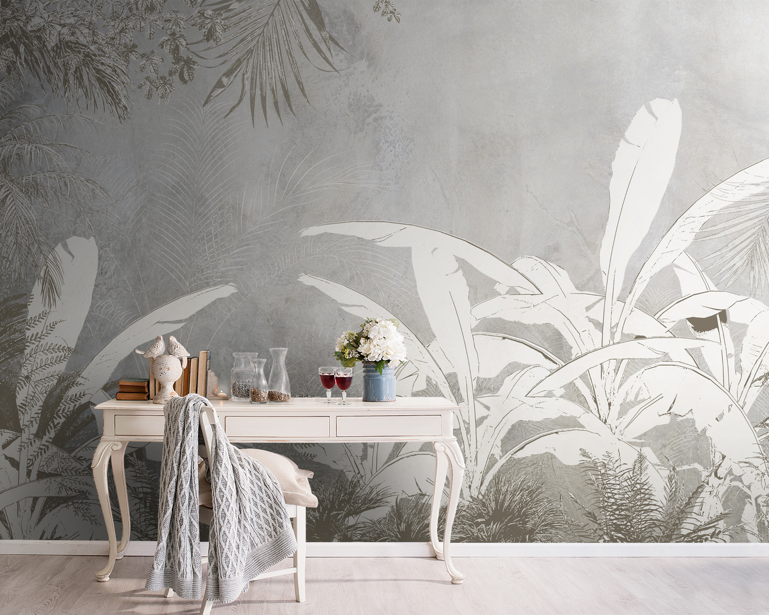 Transform any room into a serene oasis with this stunning white and grey wallpaper mural featuring delicate plants. Imagine waking up to this calming nature scene, a gentle reminder of the great outdoors, minus the bugs. It’s like having a permanent spring day inside your home! Perfect for a child’s room or a cozy nook, this mural invites creativity and exploration. And hey, it could even inspire little ones to become future botanists—who knows? With its soft tones and intricate details, it adds just the right touch of elegance and whimsy. Such a fun way to elevate your space!