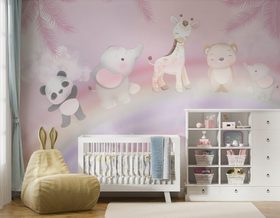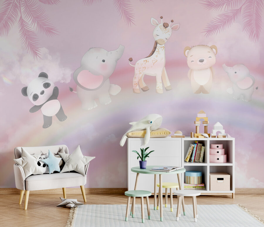 Imagine entrar no quarto do seu filho e ser recebido por este grupo encantador – um panda adorável, uma girafa gentil, um urso acolhedor e os seus amigos brincalhões. Este “Papel de parede Cartoon of a Panda” é mais do que uma simples decoração; é como entrar num sonho caprichoso. Céus cor-de-rosa suaves e nuvens fofas criam um pano de fundo relaxante, enquanto um arco-íris pastel liga tudo – parece um abraço, não é? Ideal para os quartos das crianças, o mural dá um toque de alegria e maravilha, provocando aventuras imaginativas todos os dias. Perfeito para estimular a criatividade do seu filho e transformar o seu espaço num retiro mágico. É muito bonito, não é?