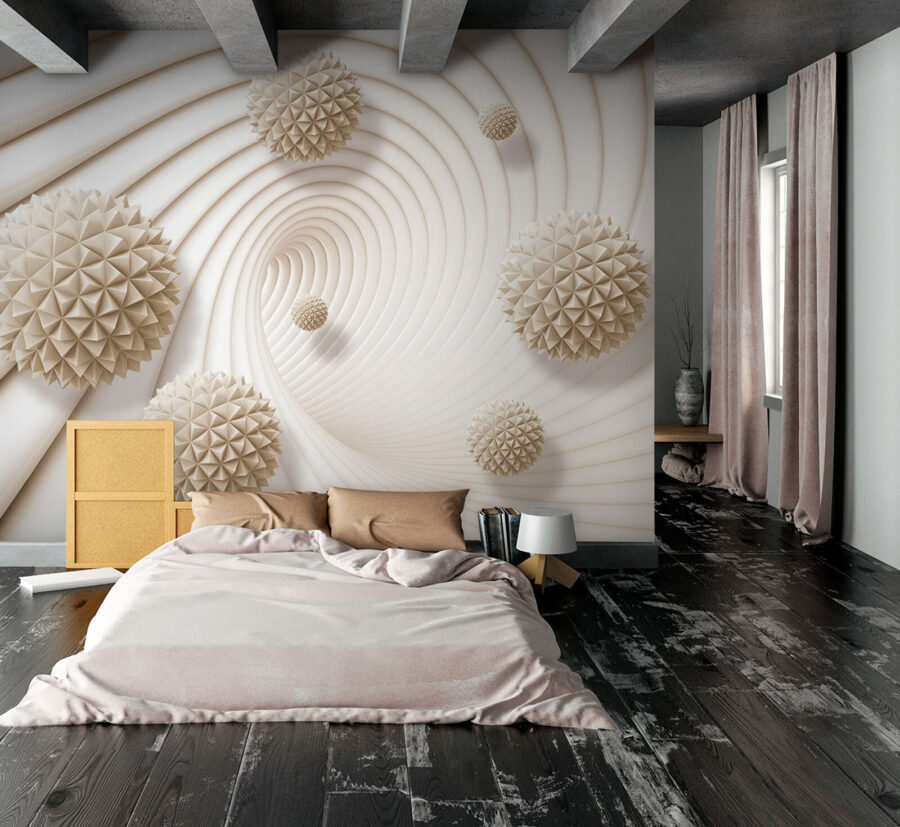 Imagine entrar numa sala e sentir-se como se tivesse acabado de entrar numa galeria de arte moderna e chique. Este mural, com as suas esferas brancas abstractas cobertas de triângulos, acrescenta instantaneamente um efeito de túnel 3D ao seu espaço. É como mergulhar numa dimensão futurista – sem deixar o conforto da sua própria casa. A mistura de geometria e profundidade torna qualquer divisão um pouco mais intrigante. É o tipo de design que suscita conversas, quer esteja a relaxar com um bom livro ou a organizar um encontro informal. Apenas uma pequena fatia de estilo vanguardista para elevar a sua vibração quotidiana e transformar paredes sem graça num ponto de fascínio.
