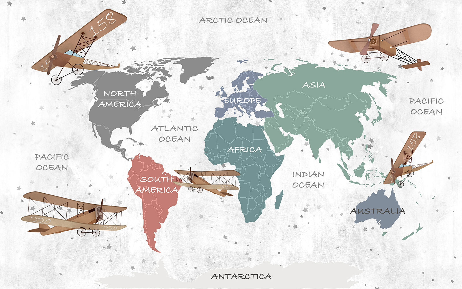 E estes pequenos aviões giros? Quase que nos fazem ouvir o barulho quando voam sobre os continentes. Ótimo para estimular a imaginação antes de dormir. Este mapa encantador faz mais do que embelezar as paredes; é uma porta de entrada para explorar terras longínquas e sonhar grandes sonhos! Quer seja para histórias de embalar ou para brincadeiras, este mural tem aquele toque especial. Uma bela adição ao quarto de qualquer filha ou filho, e uma forma rápida de se tornar o pai mais fixe (não que já não o seja). 🗺️❣️