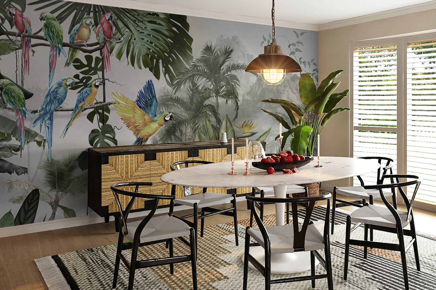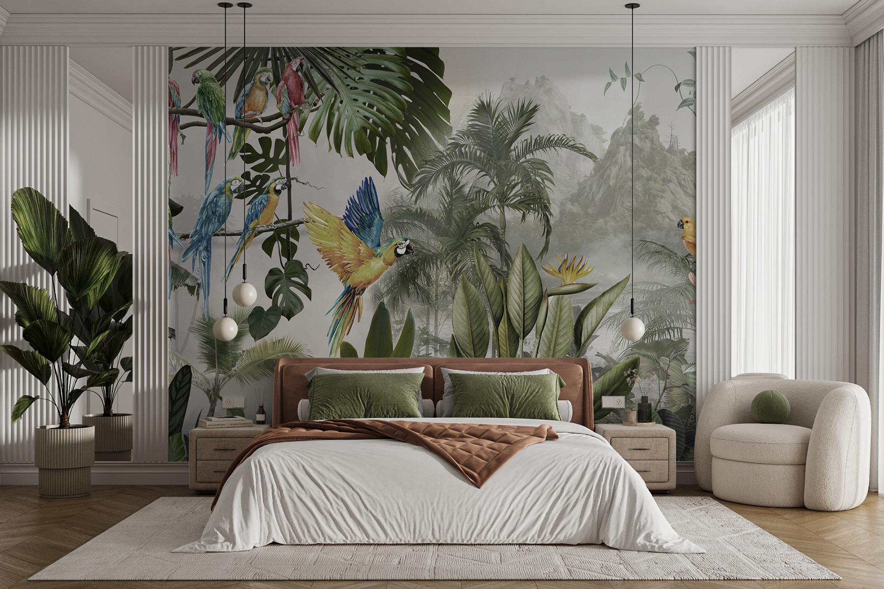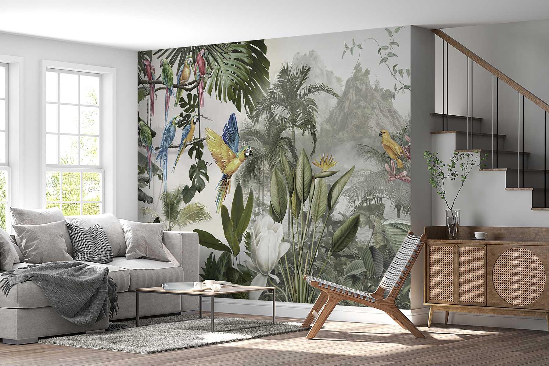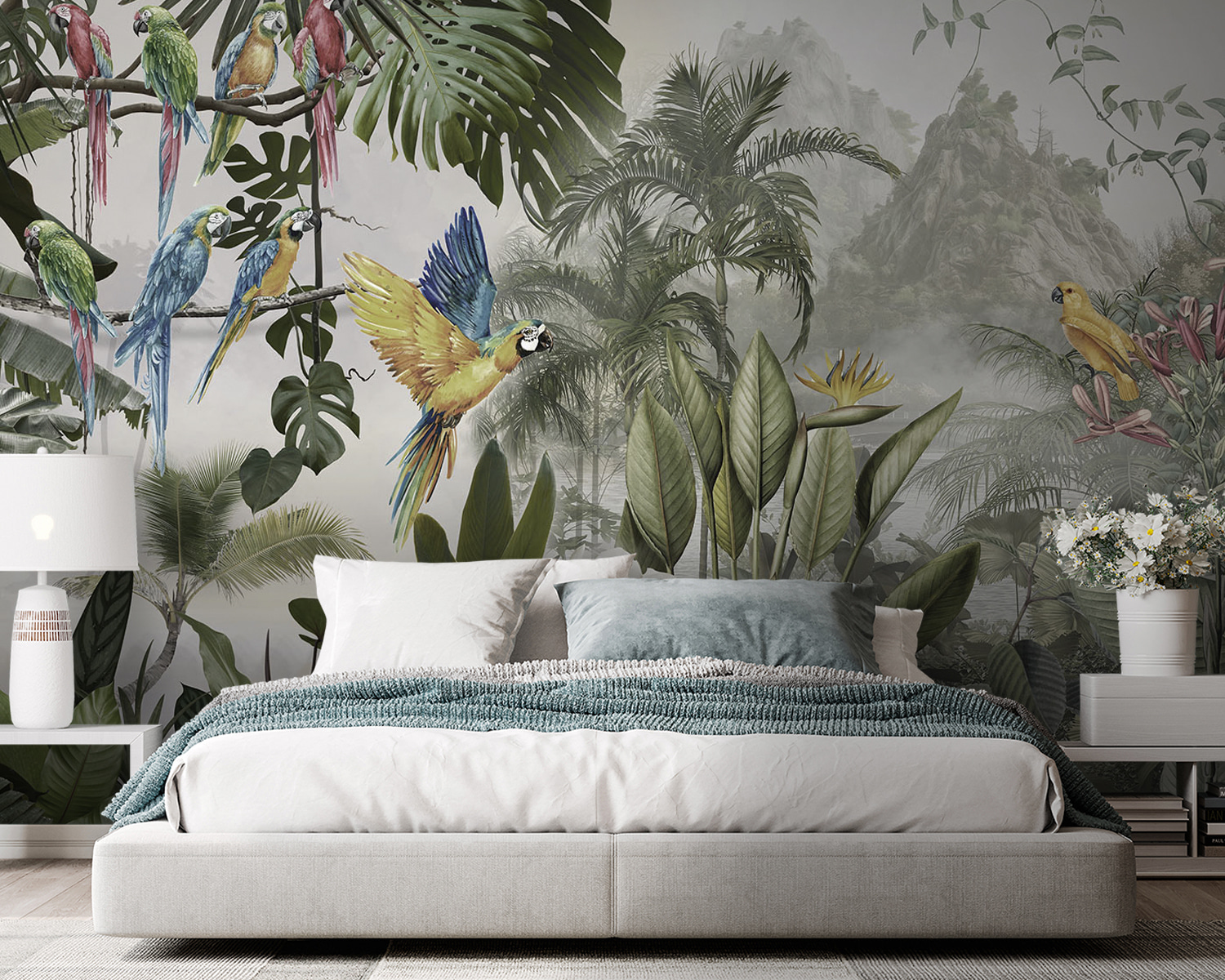 Transforme qualquer parede numa fuga vibrante com este deslumbrante mural de papagaios coloridos em pleno voo. Imagine entrar numa sala onde estes amigos emplumados parecem voar pelo ar, cada grito ecoando o fascínio de um paraíso tropical. É como trazer um pedaço da natureza para dentro de casa, sem a humidade. As folhas exuberantes e as flores vibrantes dão-lhe vida, criando este cenário de sonho que desperta alegria e calor.