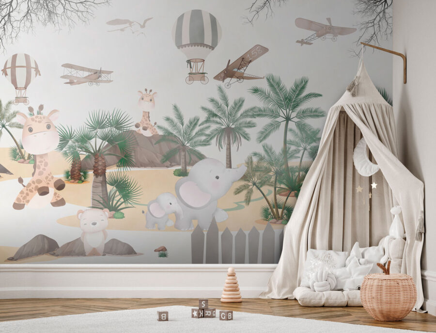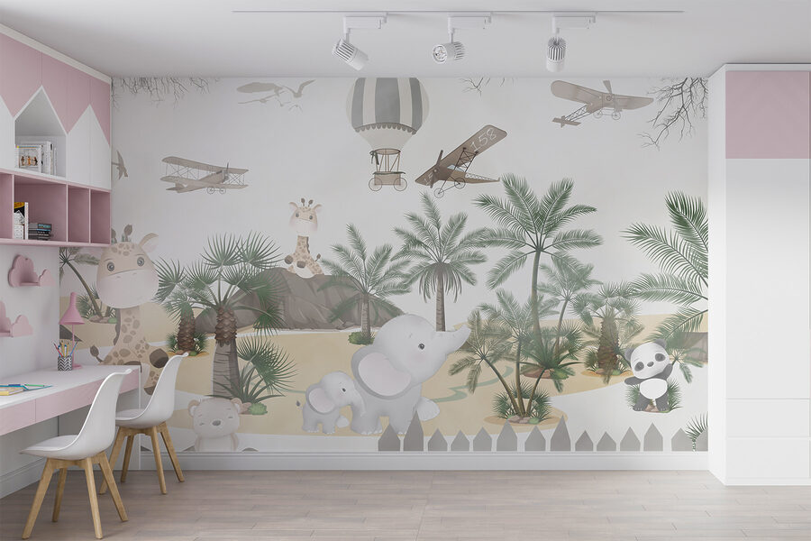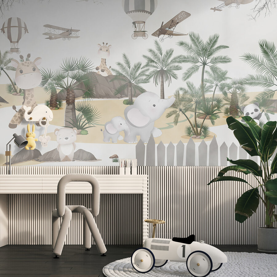 Quase se ouve o farfalhar das folhas das palmeiras e vê-se a cara dos mais pequenos a iluminar-se de entusiasmo e curiosidade. Dê vida à imaginação com este mural de parede encantador, perfeito para despertar alegria e inspiração no espaço de qualquer criança.