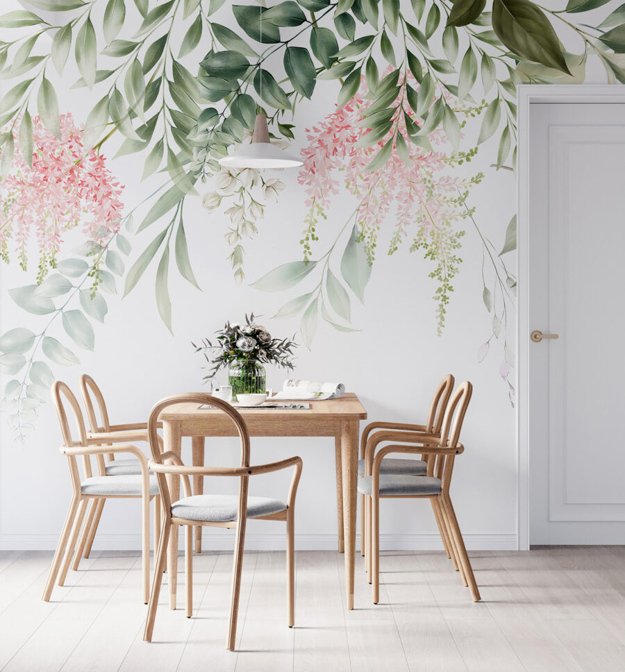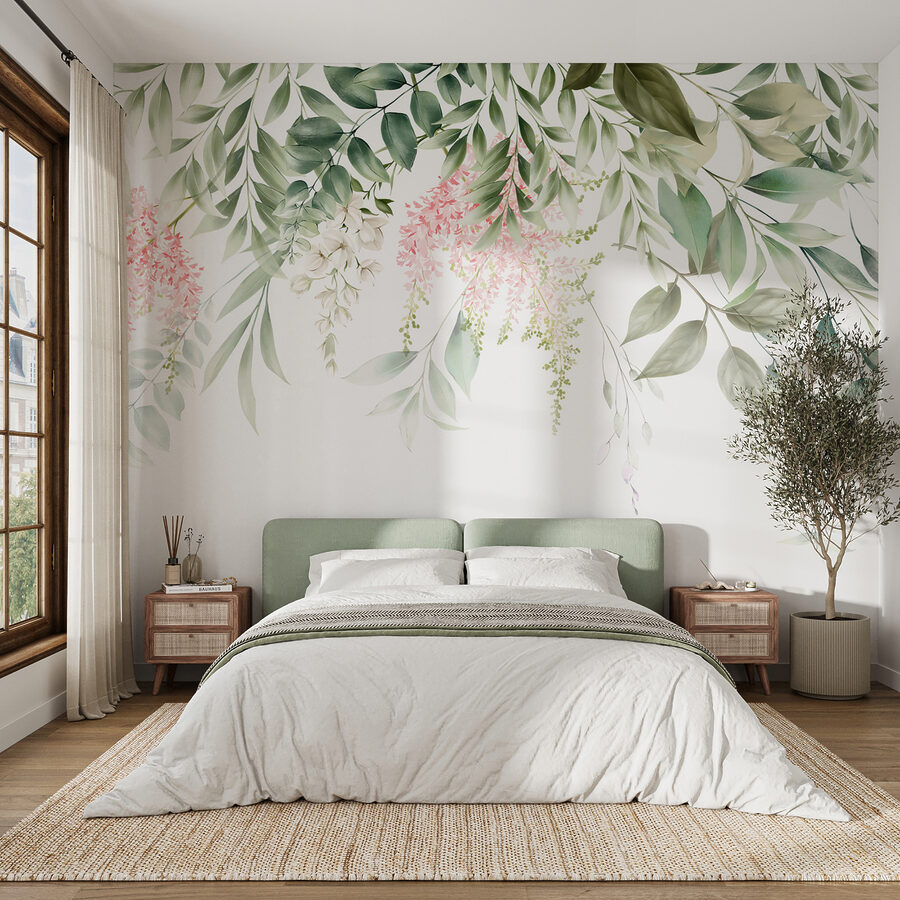 Imagine entrar numa divisão e sentir-se instantaneamente reconfortado por este elegante mural floral. Tons suaves de rosa e verde caem em cascata pela parede, como uma brisa suave de jardim. É a mistura perfeita – moderna mas intemporal. Ótimo para uma sala de estar, um quarto ou até mesmo um escritório em casa com estilo. As delicadas folhas e flores podem fazê-lo sentir-se como se estivesse a descansar num jardim botânico ensolarado, mesmo nos dias mais chuvosos. Por isso, se procura adicionar um toque de magia inspirada na natureza ao seu espaço, este mural pode ser exatamente o que precisa.