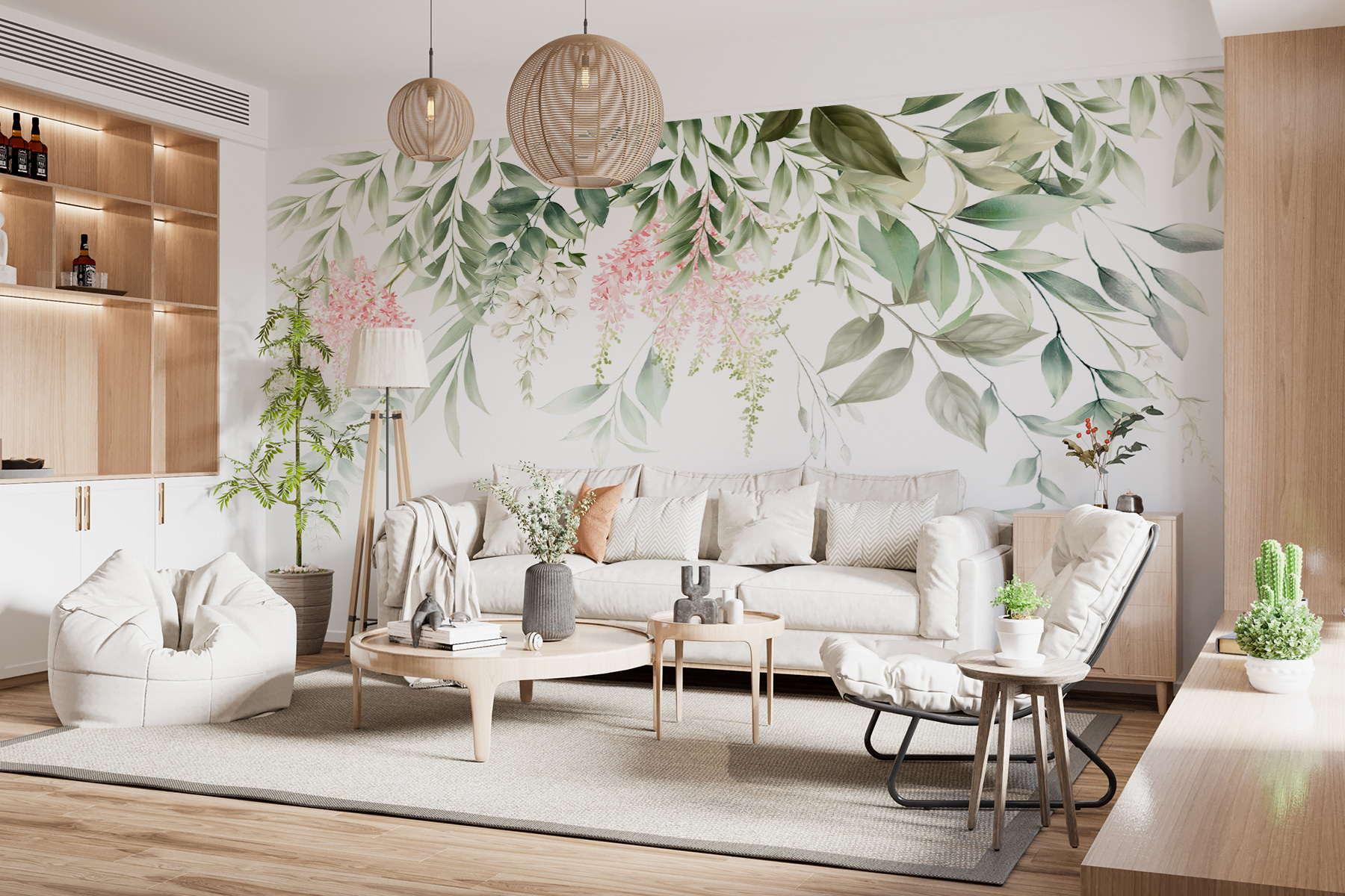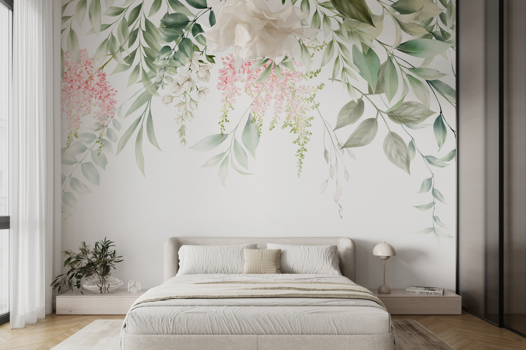 Imagine entrar numa divisão e sentir-se instantaneamente reconfortado por este elegante mural floral. Tons suaves de rosa e verde caem em cascata pela parede, como uma brisa suave de jardim. É a mistura perfeita – moderna mas intemporal. Ótimo para uma sala de estar, um quarto ou até mesmo um escritório em casa com estilo. As delicadas folhas e flores podem fazê-lo sentir-se como se estivesse a descansar num jardim botânico ensolarado, mesmo nos dias mais chuvosos. Por isso, se procura adicionar um toque de magia inspirada na natureza ao seu espaço, este mural pode ser exatamente o que precisa.