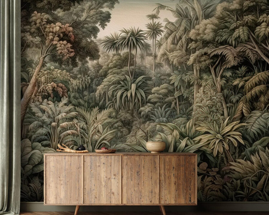 Alguma vez sonhou em transformar uma divisão num paraíso tropical exuberante? Este mural “Floresta tropical densa” tem tudo o que precisa! É como entrar numa selva diretamente da sua sala de estar – muito fixe, não é? Os vários tons de verde e a folhagem intrincada atraem-no, fazendo-o sentir como se estivesse a explorar uma floresta tropical exótica sem precisar de um passaporte. Imagine-se a beber o seu café da manhã rodeado por toda esta vida vegetal vibrante – parece uma mini-férias todos os dias. Perfeito para quem deseja um pouco mais de natureza em seu espaço; é como ter seu próprio retiro escondido na selva! 🌿🌴🏡