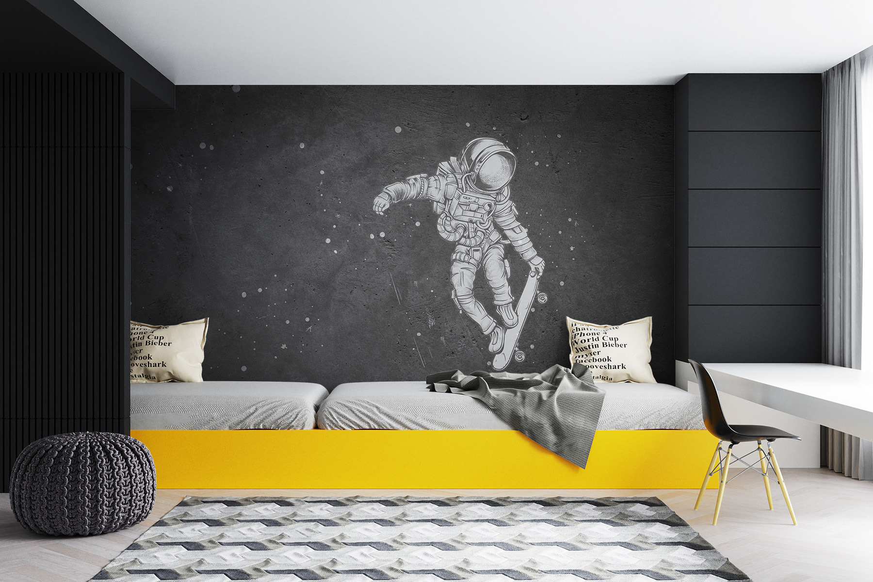 Transforme o seu espaço com este mural de parede peculiar que apresenta um astronauta a percorrer sem esforço o cosmos numa prancha de skate. É uma reviravolta divertida que fará cócegas na imaginação de qualquer pessoa, lembrando-nos que a vida deve ser tão aventureira como uma viagem espacial. Imagine-se a receber amigos e os seus olhos a arregalarem-se ao verem esta peça única – é certo que vai dar origem a conversas! O mural combina a emoção do skate com a maravilha do espaço exterior, trazendo uma vibração divertida que é simultaneamente fria e cósmica. Perfeito para o quarto de um miúdo ou para qualquer espaço que deseje uma pitada de frescura!