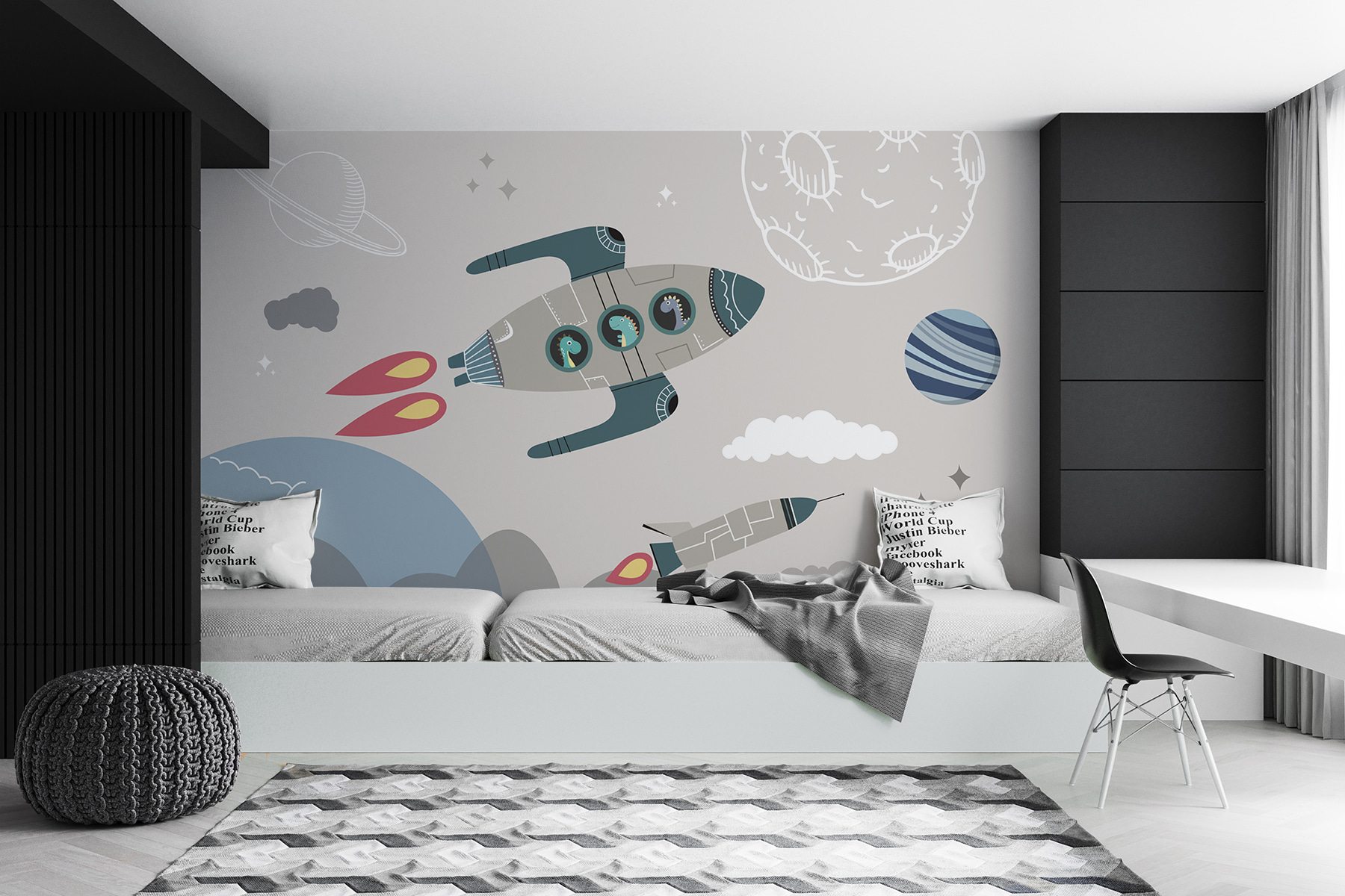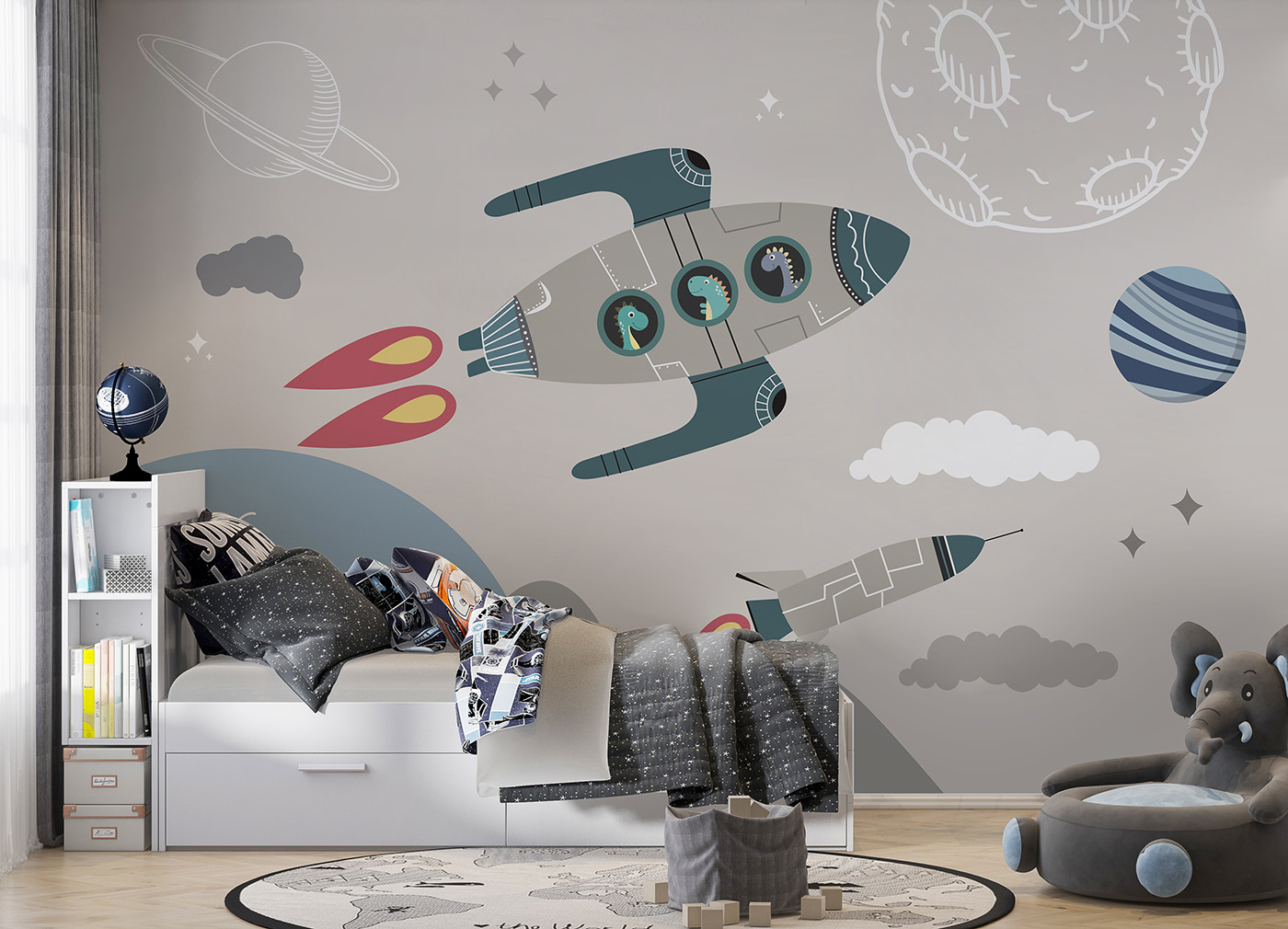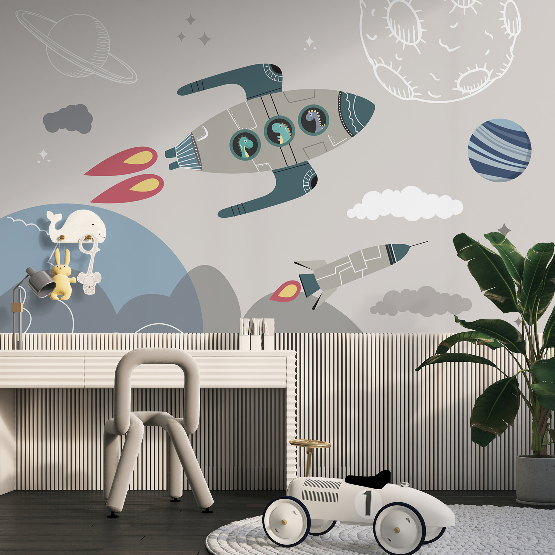 Imagine isto: dinossauros a voar pelo espaço em foguetões! É pura magia numa parede! Perfeito para o quarto de qualquer criança, este mural dá azo a aventuras sem fim e a uma imaginação selvagem. Pense em histórias para adormecer sobre astronautas T-Rex e aterragens em luas de dinossauros. Ver os olhos do seu filho a iluminarem-se sempre que o vêem – isso não tem preço. As cores são suaves e envolventes, criando um ambiente acolhedor mas estimulante. É uma mistura extravagante de charme pré-histórico e de frescura da era espacial. Ideal para pequenos sonhadores e futuros exploradores. Hora de dormir com um foguetão? Sim, por favor!