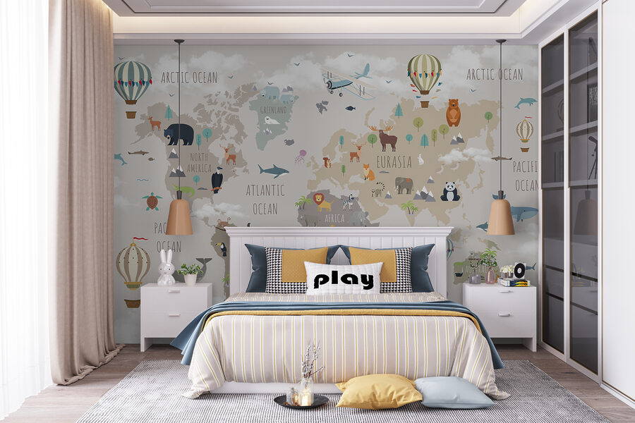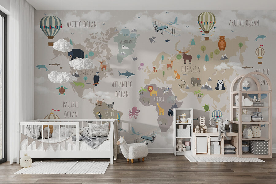 Este mural não é apenas uma decoração – é uma experiência completa. As crianças podem aprender sobre os diferentes continentes e oceanos enquanto vêem os seus animais favoritos, desde os ursos polares na Gronelândia aos cangurus na Austrália. As cores suaves são calmantes, perfeitas para histórias para adormecer ou tardes preguiçosas de domingo. É o tipo de decoração que desperta a imaginação e a curiosidade, tornando-a óptima para infantários, salas de jogos ou mesmo salas de aula. Além disso, descobrir novos pormenores todos os dias mantém a magia viva.