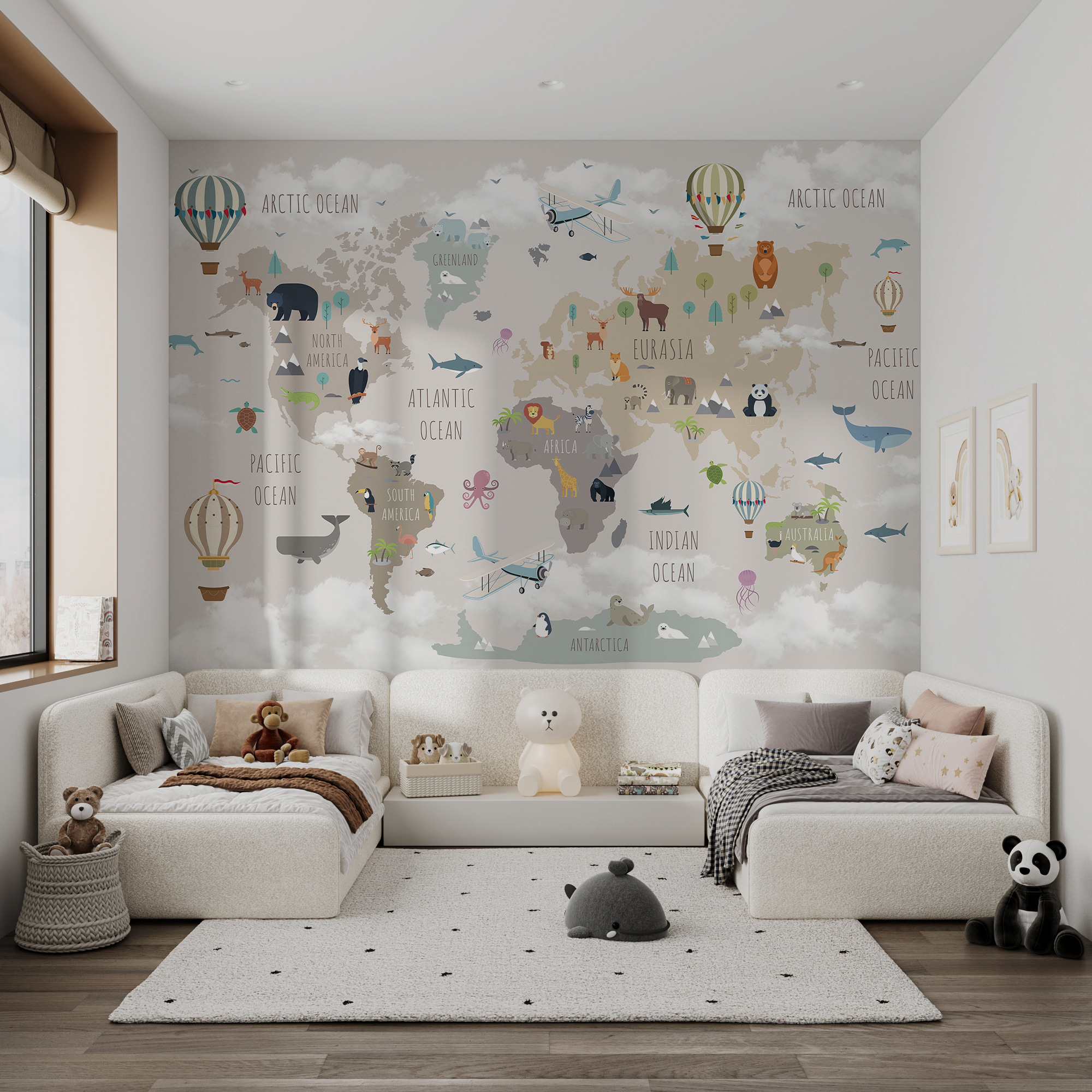 Este mural não é apenas uma decoração – é uma experiência completa. As crianças podem aprender sobre os diferentes continentes e oceanos enquanto vêem os seus animais favoritos, desde os ursos polares na Gronelândia aos cangurus na Austrália. As cores suaves são calmantes, perfeitas para histórias para adormecer ou tardes preguiçosas de domingo. É o tipo de decoração que desperta a imaginação e a curiosidade, tornando-a óptima para infantários, salas de jogos ou mesmo salas de aula. Além disso, descobrir novos pormenores todos os dias mantém a magia viva.