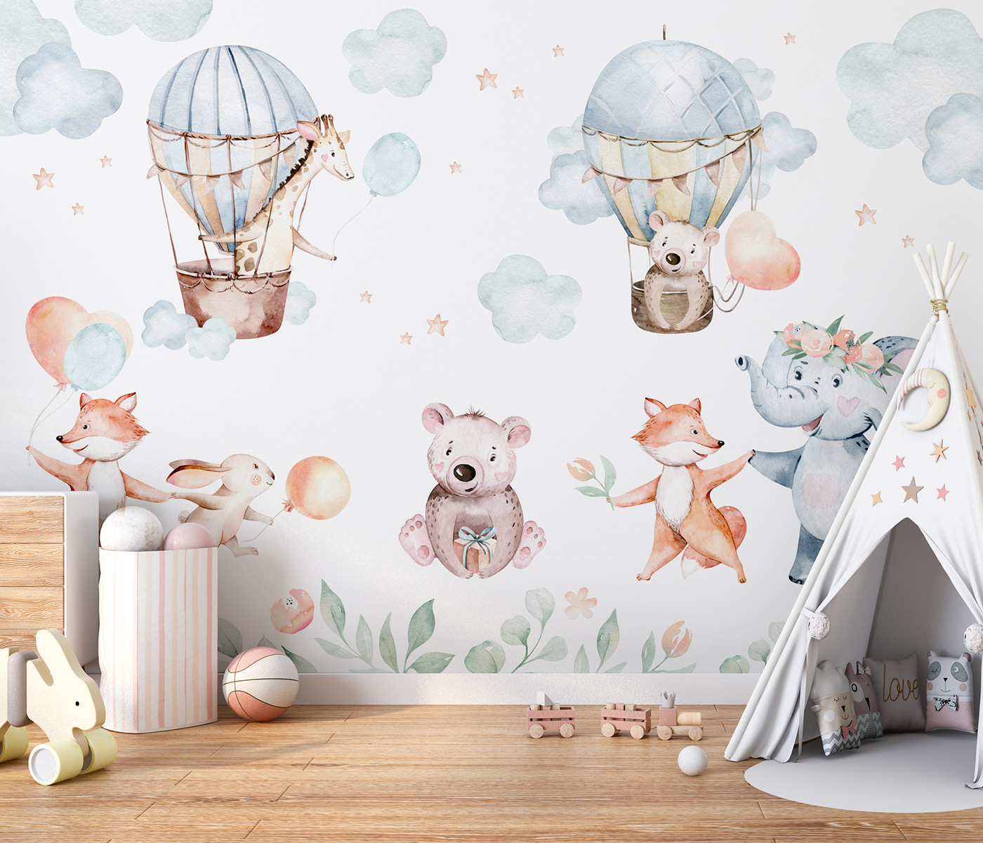 Imagine isto – o seu filho a olhar para ela, provocando risos e brincadeiras imaginárias sem fim. Ou talvez seja apenas um adulto divertido que adora uma decoração única e divertida. Ver aquela girafa a espreitar para fora do cesto, segurando um balão, é suficiente para levantar o ânimo de qualquer um. Ótimo para criar um santuário encantador onde os doces sonhos voam. Este mural não se limita a decorar as paredes; ele pinta a felicidade. Crianças ou adultos, quem não gostaria de dançar de alegria numa sala adornada com tanto encanto?