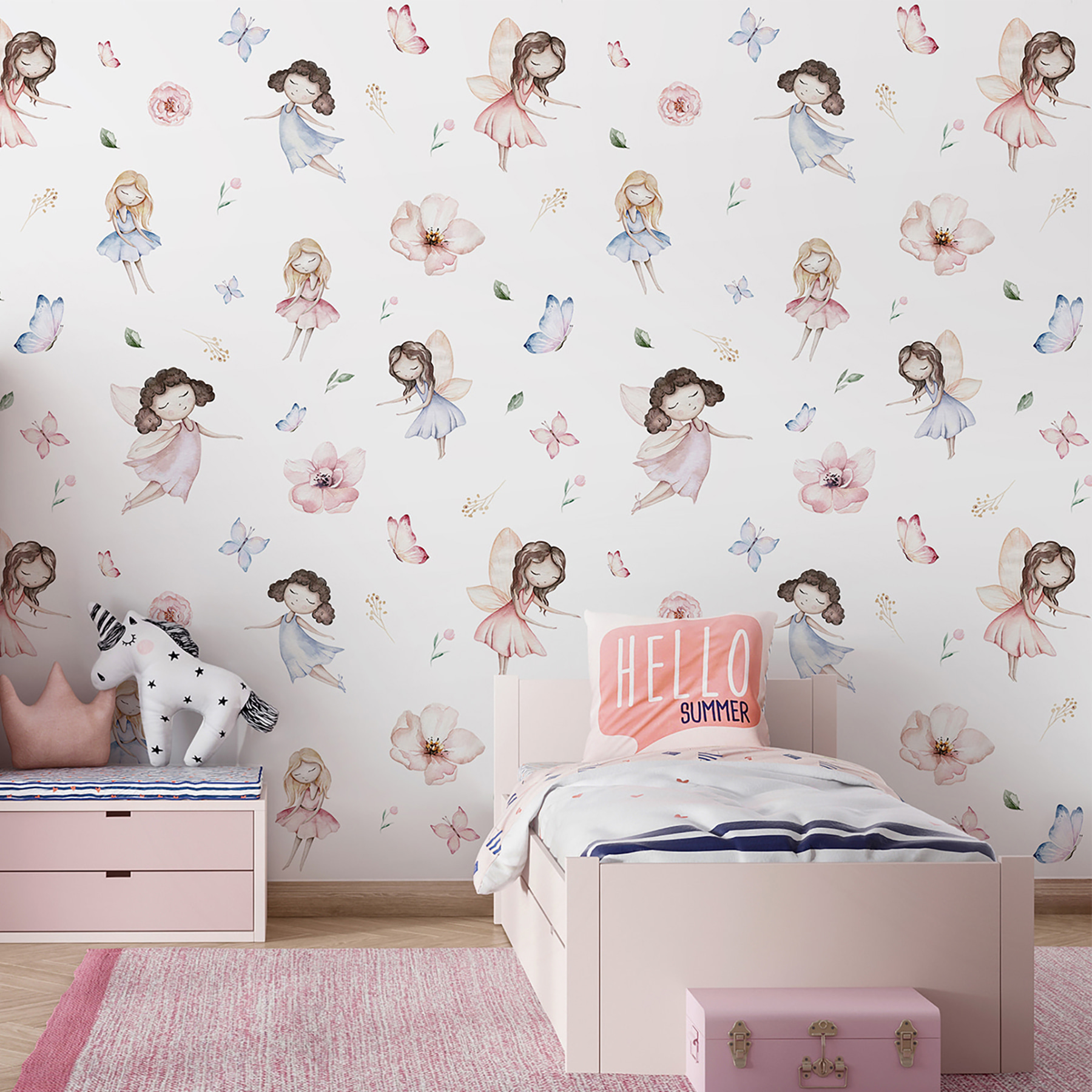 Imagine entrar numa sala e ser recebido por este mural encantador. É como entrar num conto de fadas caprichoso, certo? Este mural “Desenho de uma rapariga de vestido” está a rebentar de encanto e inocência. Perfeito para o espaço do seu pequeno, apresenta ilustrações doces de raparigas em vestidos adoráveis, rodeadas por borboletas esvoaçantes e flores delicadas.
