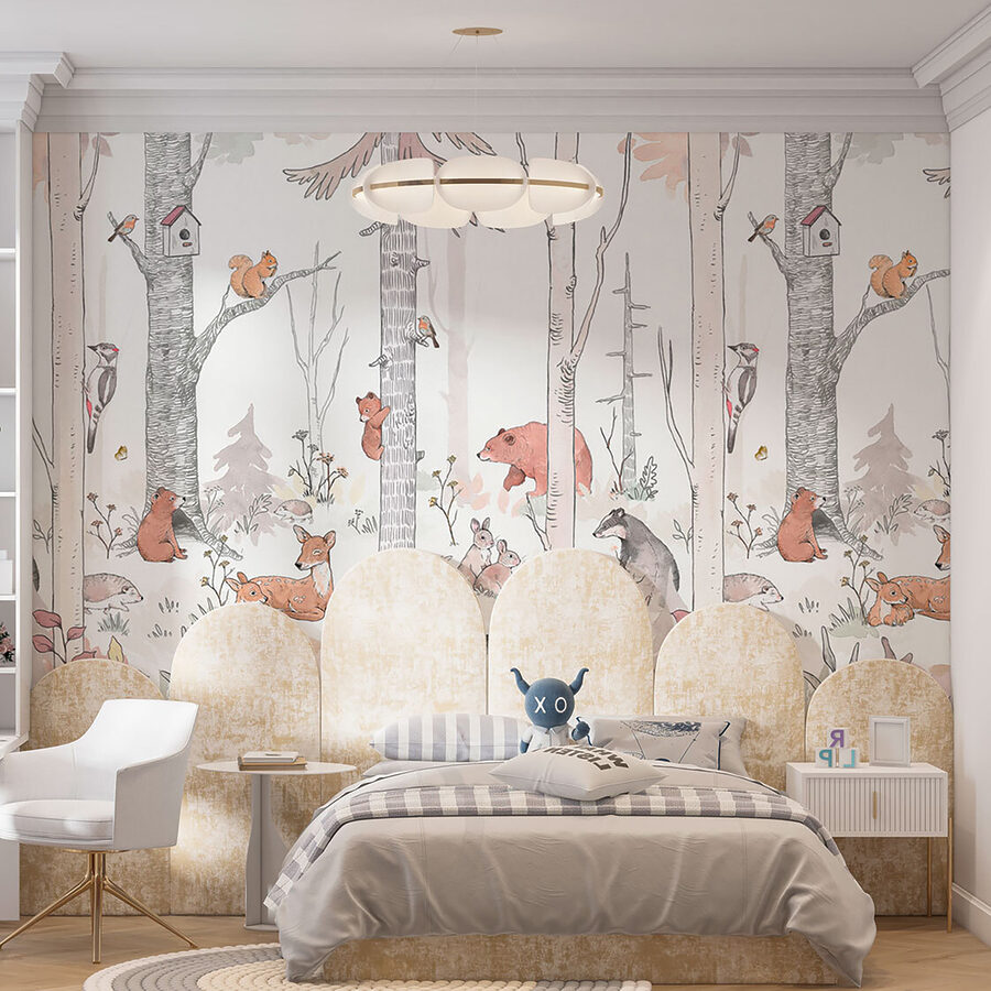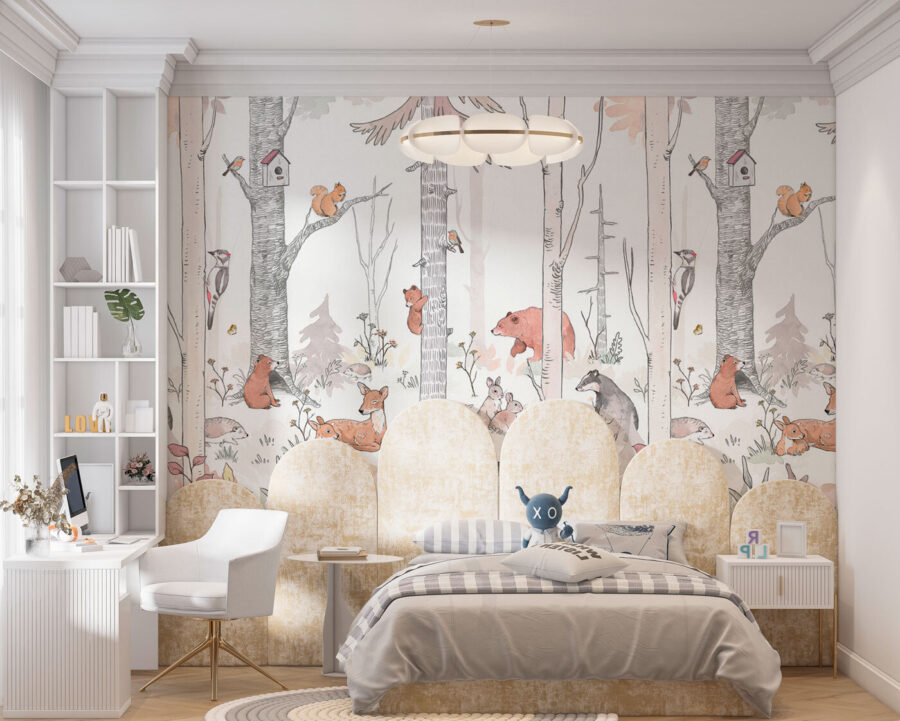 Imagine uma floresta acolhedora mesmo no seu quarto de criança – é exatamente isso que este mural traz! “Grupo de Animais numa Floresta” é como abrir um livro de histórias diretamente na sua parede. Está repleto de criaturas encantadoras da floresta: esquilos curiosos, coelhos saltitantes, ursos preguiçosos e até um veado atencioso que chama a sua atenção. As cores suaves e terrosas dão-lhe um ar calmo e mágico. Sabe, como o tipo de lugar que sonhava explorar quando era criança. Crianças? Vão adorá-lo. E até os adultos podem encontrar um pouco de paz e capricho no seu encanto. Imagine histórias de embalar com este pano de fundo – aventura instantânea! Não é apenas um mural, é um mundo totalmente novo onde se pode perder. Perfeito para infantários, salas de jogos ou para qualquer lugar onde seja necessária uma pitada de magia da floresta. Crie memórias e desperte a imaginação – diretamente na sua parede!