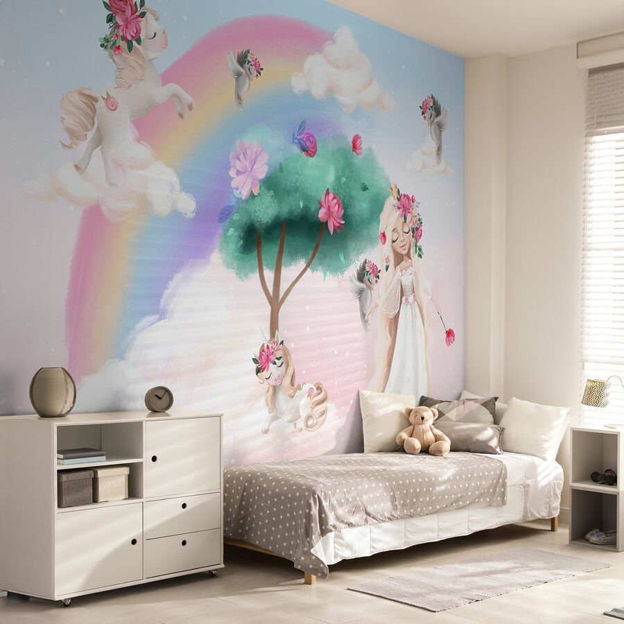 Imagine isto – entrar num quarto onde os unicórnios se pavoneiam em nuvens fofas e os arco-íris se arqueam graciosamente sobre uma cena extravagante. Este mural de parede “Unicórnios e arco-íris em cena mágica” transforma o quarto de qualquer criança num paraíso de sonho. Perfeito para infantários, salas de jogos ou qualquer espaço para amantes de unicórnios, combina cores vibrantes e elementos de fantasia para despertar a imaginação. Imagine o seu pequeno a olhar para os encantadores unicórnios e talvez até a sonhar com as suas próprias aventuras. Não se trata apenas de um mural – é uma experiência mágica todos os dias! Além disso, é uma forma divertida de inspirar a narração de histórias ou de tornar a hora de deitar um pouco mais encantada.