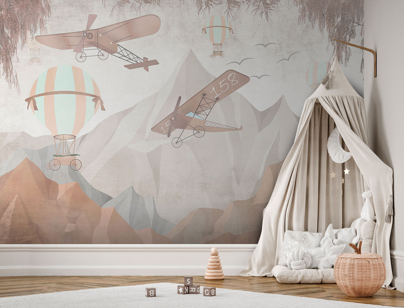 Imagine o seu pequeno a olhar para cima, talvez imaginando que está a andar num desses balões encantadores. Não se trata apenas de uma pintura de parede, é um trampolim para aventuras e histórias no país dos sonhos. Quer o seu filho esteja a sonhar em pilotar um avião antigo ou a flutuar sobre as nuvens, este mural desperta facilmente a criatividade e a alegria. Sente-se inspirado? Sim, é assim tão poderoso. Além disso, quem não adoraria um pano de fundo que é basicamente uma fuga instantânea para o topo de uma montanha serena? Totalmente encantador.