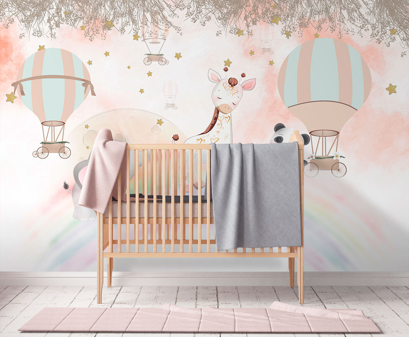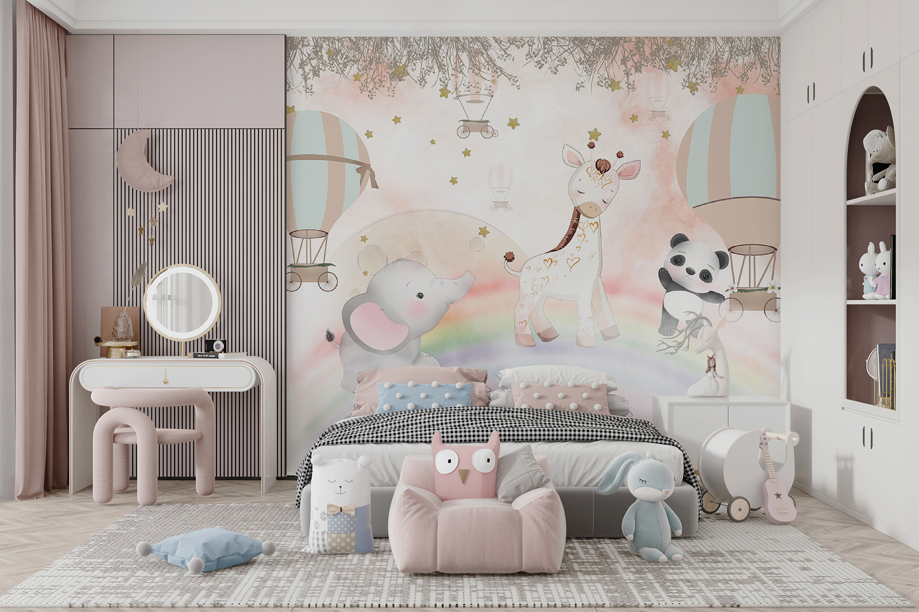 Ilumine o quarto de qualquer criança com este encantador mural de balões de ar quente! Imagine um céu de sonho cheio de balões extravagantes a flutuar sobre animais adoráveis – como uma girafa encantadora, um panda brincalhão e um pequeno elefante doce. É uma cena que convida à aventura e desperta a imaginação. Imagine os mais pequenos a olharem para ela, a mergulharem na terra dos sonhos, a sonharem em voar acima das nuvens. As cores suaves criam um ambiente acolhedor, perfeito para histórias de embalar fofinhas. Este mural não é apenas uma decoração; é uma porta de entrada para um mundo de fantasia. Quem não gostaria de se juntar a esses passeios de balão? Transformará qualquer espaço num refúgio lúdico!