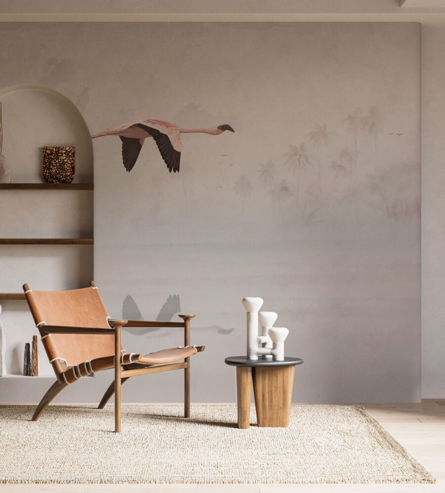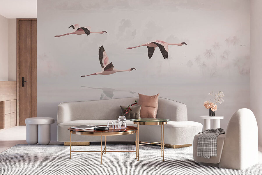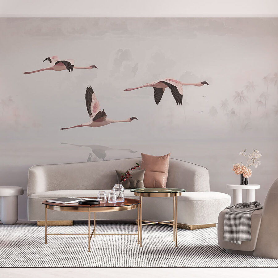 Quer seja para a sua sala de estar, quarto, ou mesmo para um espaço de trabalho criativo, este mural acrescenta um toque inesperado de elegância e calma. E, se tiver filhos, imagine a alegria deles ao verem um bando de flamingos na parede – é como dar asas à imaginação!