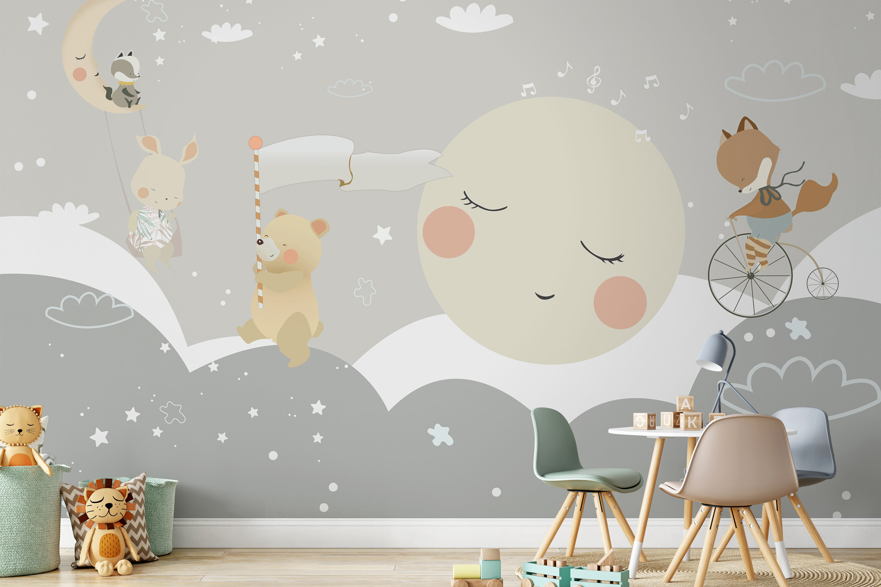 Veja este adorável mural de parede, “Estrela branca num fundo cinzento”. É como entrar numa história de sonho para dormir, perfeita para um quarto de criança ou sala de jogos. Este mural apresenta um fundo cinzento calmante polvilhado com estrelas cintilantes, uma lua sonolenta e amigos animais bonitos. Imagine um urso adormecido e uma raposa a cavalgar um penny-farthing – delícias totais para os pequenos exploradores!