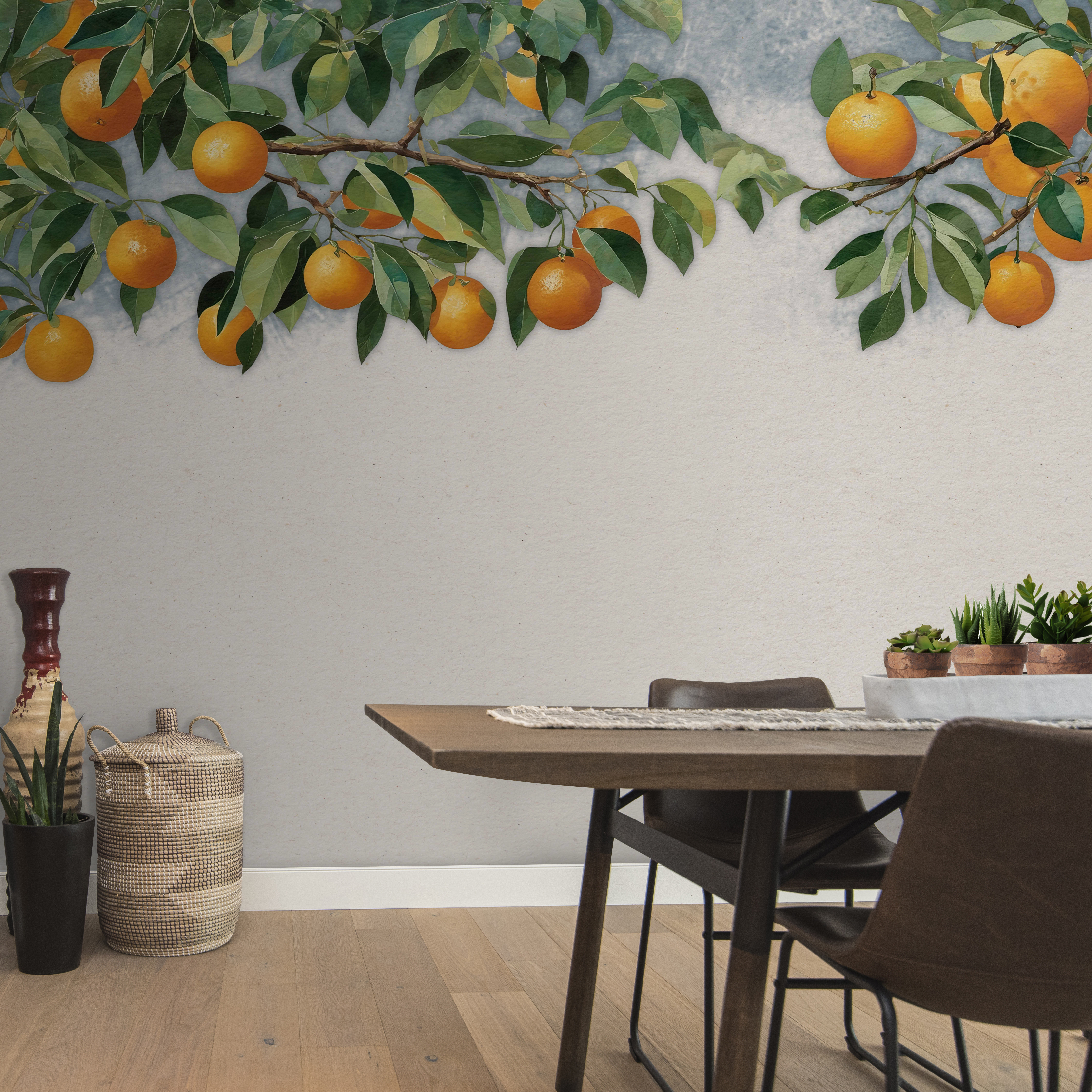 Ilumine qualquer divisão com este mural encantador que apresenta laranjas alegres penduradas em ramos exuberantes. É como entrar num pomar solarengo sem sair de casa. Imagine-se a beber o seu café da manhã em frente a este cenário vibrante, sentindo as boas vibrações a chegar. Perfeito para uma cozinha ou um recanto acolhedor, acrescenta sem esforço um toque de cor e calor. Os tons aquosos dão-lhe um toque de sonho, fazendo com que qualquer parede se sinta viva. Quem precisa de férias quando pode trazer uma fatia da natureza para dentro de casa? Para além disso, combina bem com qualquer estilo de decoração – é uma questão de versatilidade!