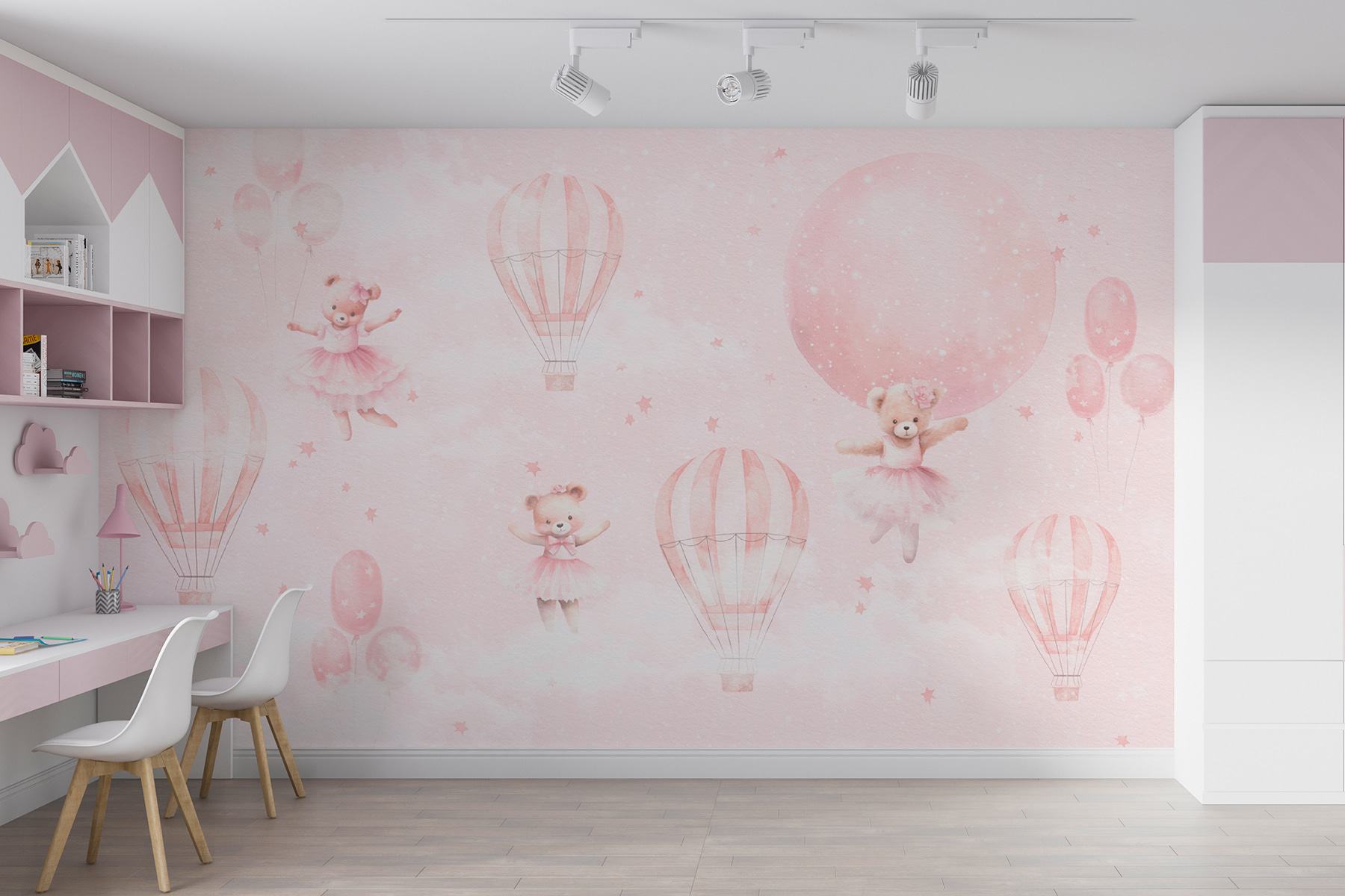 Este mural de parede é como um sonho tornado realidade para o quarto de qualquer criança, especialmente se tiver um pequeno obcecado por ursos de peluche, tutus e tudo o que é adorável. Imagine isto: ursinhos de peluche com tutus de folhos a flutuar entre nuvens suaves e pastel e balões de ar quente – é como uma cena da mais doce história para adormecer. Consegue imaginar os olhos da sua filha a brilharem no momento em que vê isto? Magia total!
