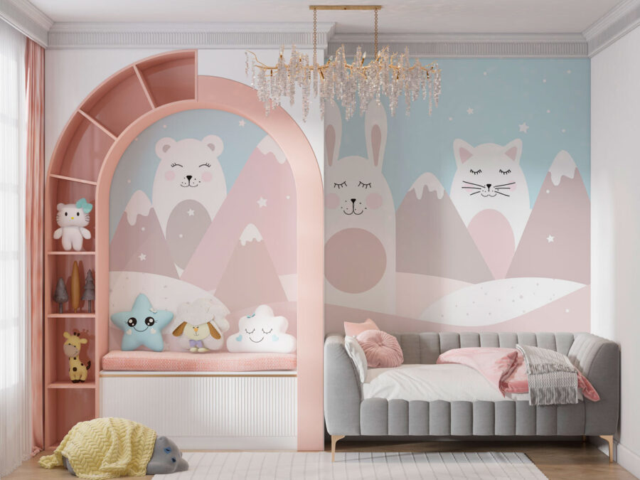 Imagine entrar no quarto do seu filho e ser recebido pelo trio mais bonito de animais nas cores mais pastel e suaves. Este mural de parede extravagante apresenta um gato branco com bochechas cor-de-rosa, aninhado entre um coelhinho simpático e um urso, todos a passear numa paisagem de sonho de montanhas suaves e estrelas cintilantes. É como se uma história de embalar ganhasse vida! Perfeito para qualquer pequeno explorador ou amante de animais, este mural traz um toque de magia e uma pitada de alegria ao seu espaço. As cores suaves e as personagens adoráveis vão certamente inspirar sonhos doces e grandes aventuras. Os pais adoram-no porque é como um abraço tranquilo e imaginativo para o quarto – quem não quereria isso?