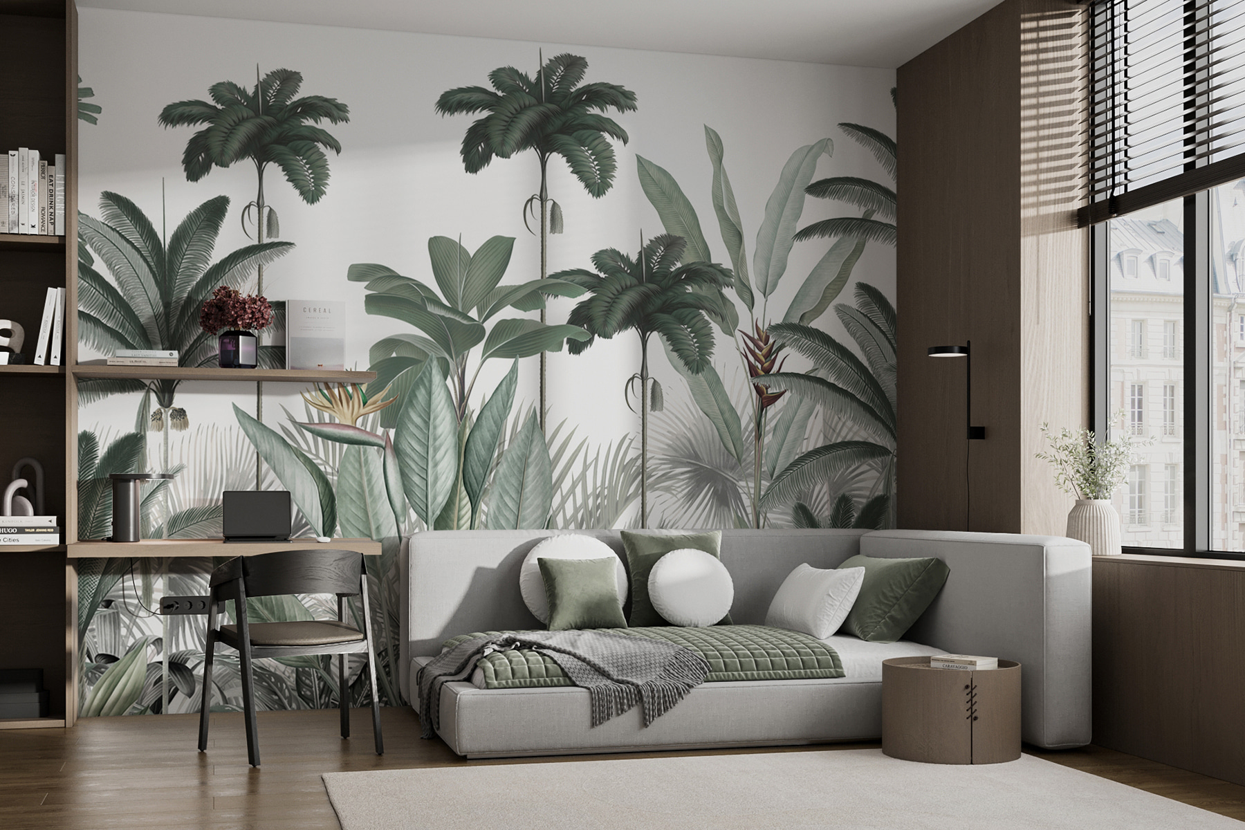 Imagine isto: está a descansar no seu sofá com uma chávena de café e olha para a sua parede para ver este belo mural. Instantaneamente, a sua disposição melhora. A vegetação, a textura – é como se a sala tivesse o seu próprio ritmo cardíaco. Os seus convidados não vão parar de falar sobre isso, e pode ser apenas o pequeno escape de que precisa depois de um longo dia. Quer seja na sua sala de estar, no escritório ou até no quarto, este mural não é apenas decoração; é uma experiência.