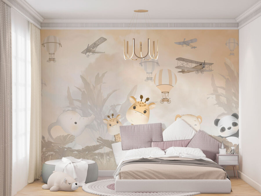 Perfeito para filhos e filhas, este mural traz uma sensação de aventura e maravilha. Os tons suaves e discretos tornam-no numa adição serena sem sobrecarregar a divisão. Imagine o seu filho a olhar para cima com os olhos arregalados de curiosidade, talvez a contar histórias de escapadelas em grande altitude ou de passeios suaves de elefante sob céus cheios de balões.
