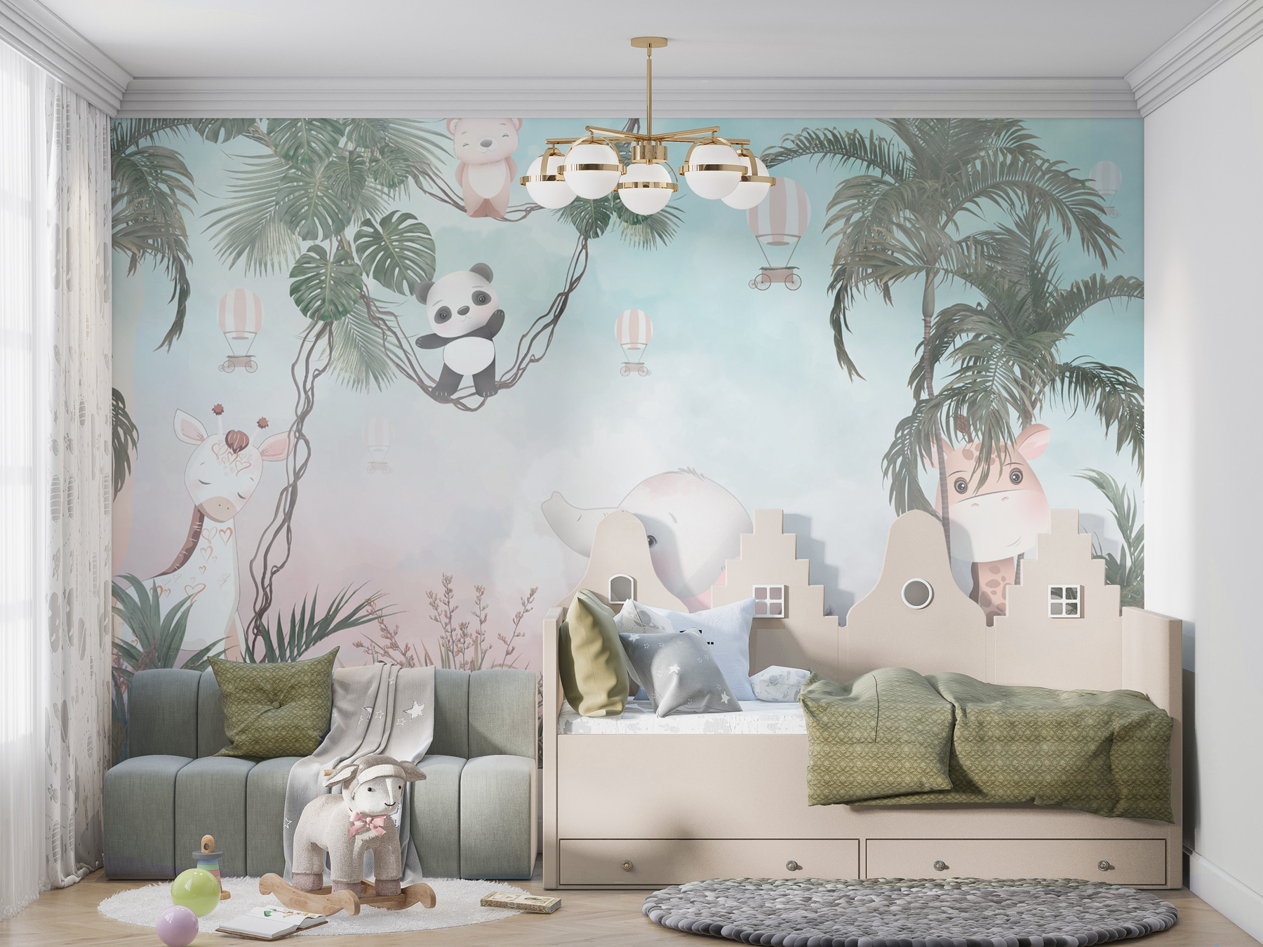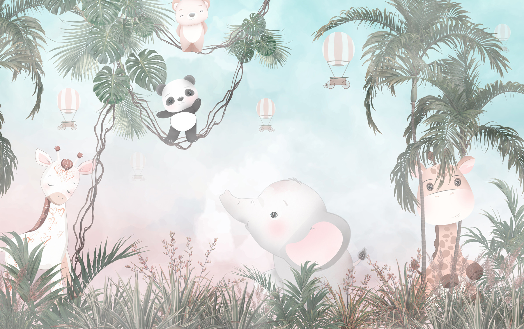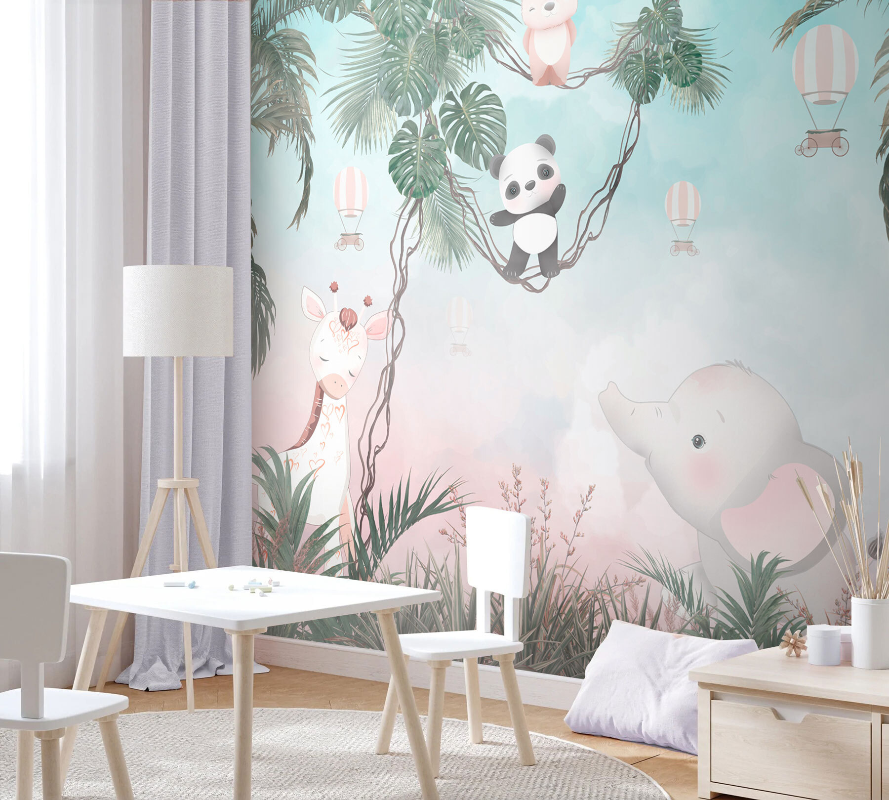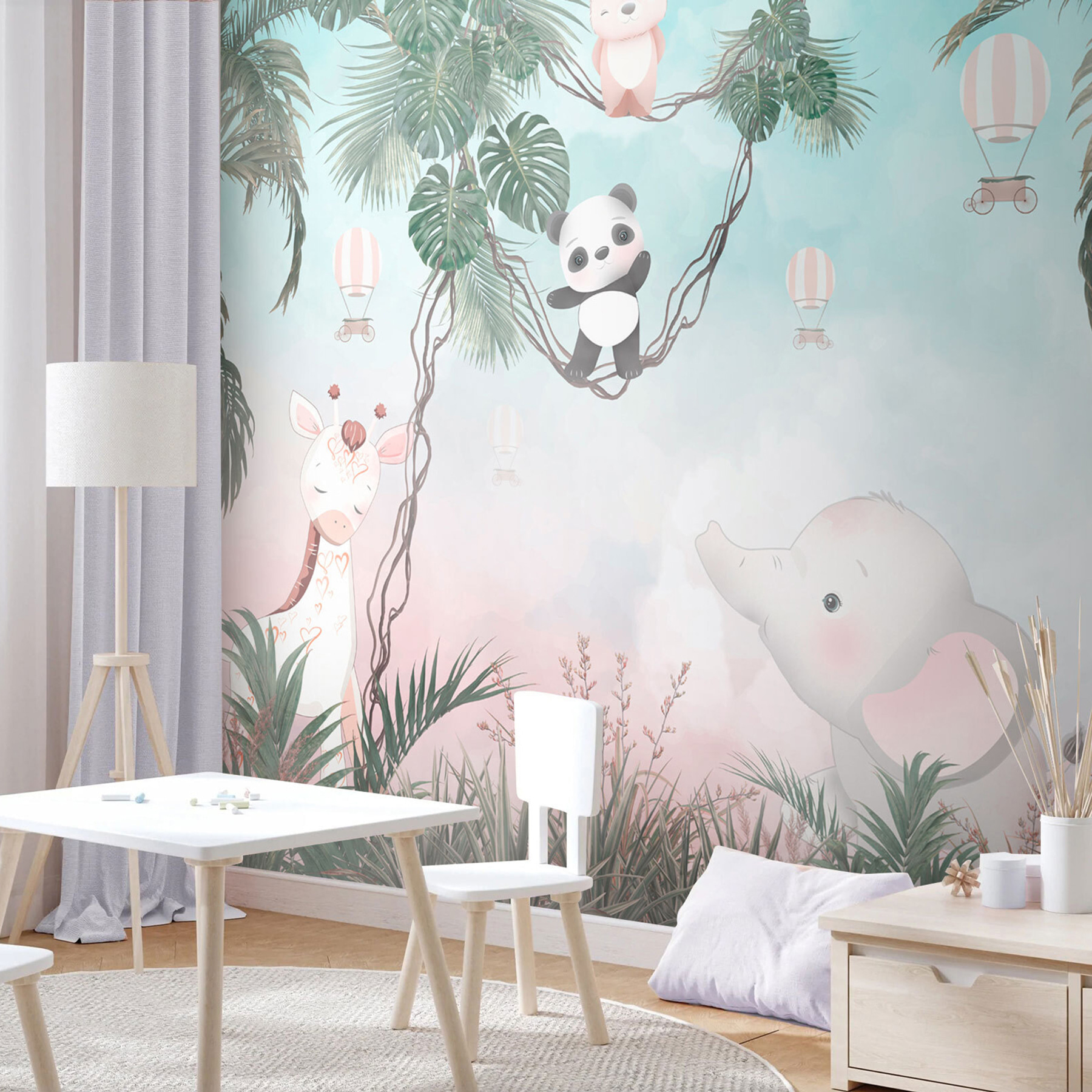 Transforme qualquer parede aborrecida numa aventura com este mural de parede que apresenta um panda de desenhos animados divertido e demasiado adorável. Imagine isto: um quarto de criança acolhedor onde o seu filho se pode imaginar a baloiçar nas árvores ao lado de um panda simpático e de um elefante que parece pronto a dar umas gargalhadas suaves. As cores suaves criam um cenário relaxante, perfeito para a hora da sesta ou da história. É como um refúgio na selva mesmo em casa. Imagine os sorrisos quando os convidados entram e vêem este cenário alegre – praticamente convida à alegria e à imaginação na sala. É uma forma fácil de fazer com que um espaço pareça um mini safari!