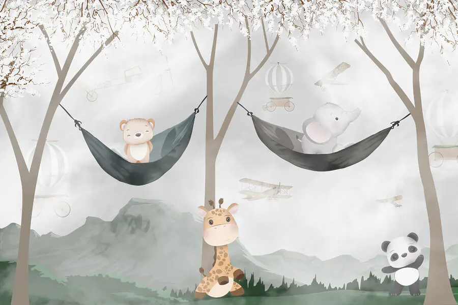 Este mural de parede caprichoso vai levá-lo diretamente para uma cena de floresta encantadora, onde um bonito panda e os seus amigos animais estão apenas a passar tempo – literalmente! Imagine isto: o urso bebé, a girafa e o elefante a descansar em redes macias penduradas entre árvores de sonho. O panda, naturalmente, está a explorar no chão. O pano de fundo? Montanhas enevoadas com aviões clássicos e balões de ar quente a flutuar suavemente.