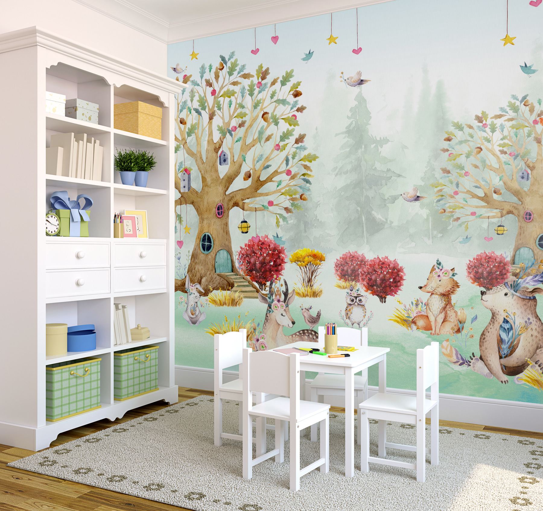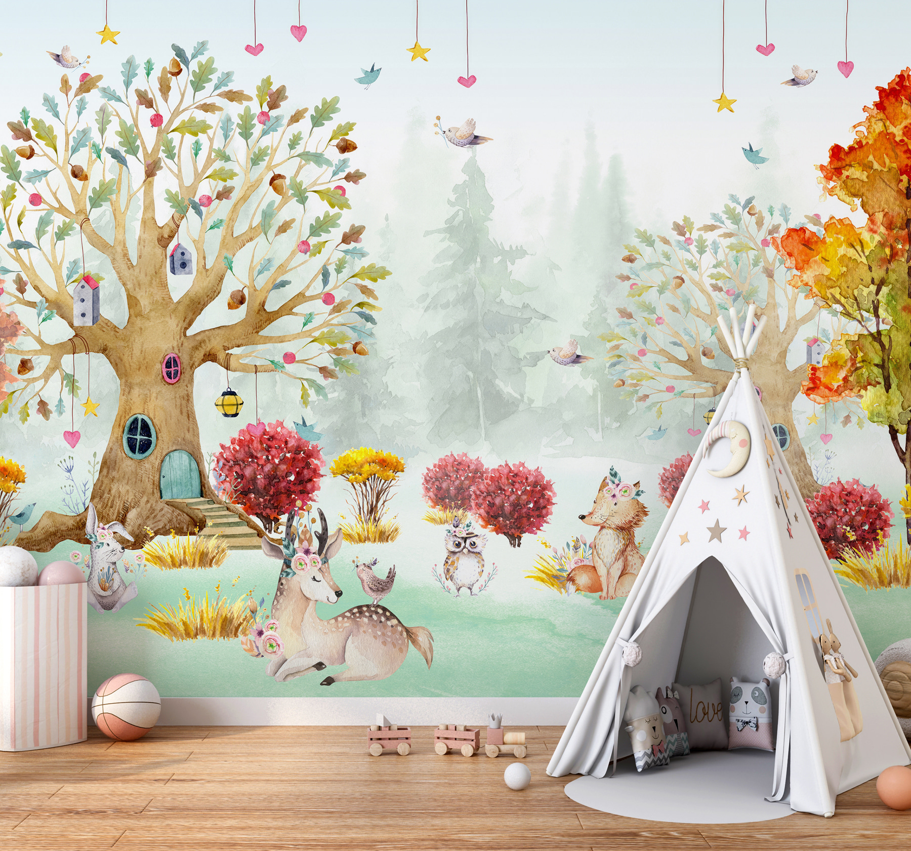 Transforme o quarto do seu filho numa terra de conto de fadas de sonho com este mural de parede “Pintura a aguarela de animais numa floresta”. Imagine os olhos do seu filho a brilharem quando vêem os caprichosos veados, raposas e corujas entre as árvores – cada um com os seus próprios pormenores engraçados e peculiares. É como entrar num livro de histórias! Perfeito para infantários e quartos de crianças, este mural traz um encanto suave e pastel que tornará as histórias de embalar ainda mais encantadoras. Quer se trate de uma floresta mágica para a sua filha ou de um bosque tranquilo para o seu filho, este mural prepara o cenário para que a imaginação e os sonhos corram soltos. As tonalidades suaves da aguarela são suaves e acolhedoras, envolvendo o espaço em calor. Este mural não é apenas decoração – é uma aventura à espera de se desenrolar!