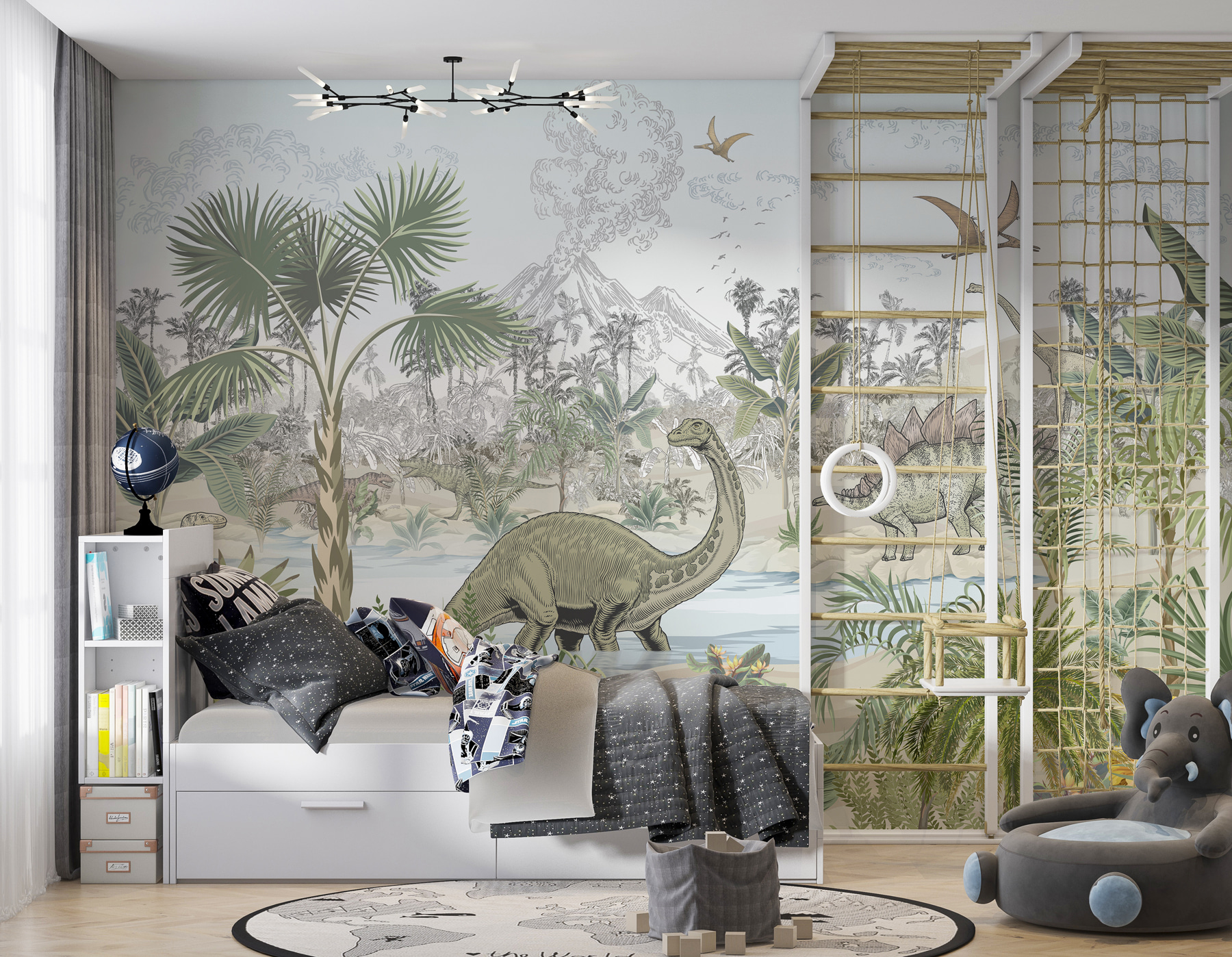 Transforme o espaço de uma criança num paraíso pré-histórico com este mural vibrante que apresenta dinossauros majestosos a vaguear pela sua exuberante casa tropical. Imagine o entusiasmo dos mais pequenos ao contemplarem estes gentis gigantes, explorando o seu mundo fantástico. Com palmeiras a balançar e um vulcão a soprar ao fundo, este mural desperta a imaginação e aventuras que vão para além das histórias de embalar.