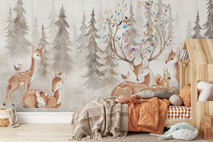 Imagine entrar num sonho de floresta todos os dias – quão encantador é isso? Este mural de parede “Bird sitting on a deer” parece um livro de histórias que ganhou vida. O veado delicado e os pássaros encantadores criam uma cena diretamente de uma floresta mágica e acolhedora. Perfeito para um berçário ou quarto de criança, traz uma sensação de maravilha e paz.