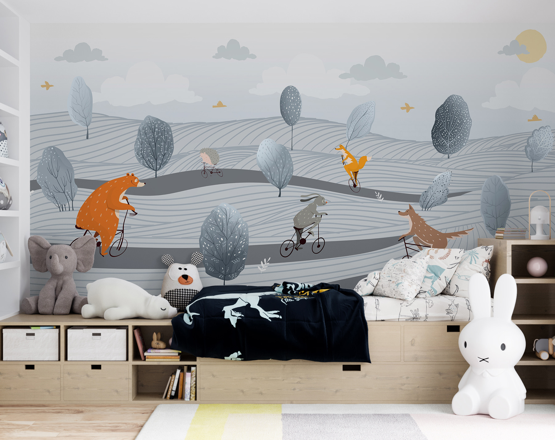 Transforme qualquer espaço com este mural caprichoso que apresenta um desfile de animais encantadores a andar de bicicleta! Imagine um urso, uma raposa e um ouriço a passear por uma paisagem de sonho. É como uma cena de um encantador livro de histórias para crianças, perfeito para despertar sorrisos e inspirar a imaginação. Quer se trate de uma sala de jogos, de um quarto de criança ou apenas de uma atualização divertida da sua área de estar, este mural acrescenta um toque lúdico que levanta o ânimo. Pense nele como um companheiro amigável nas suas paredes, convidando toda a gente a entrar nesta alegre aventura. Quem não gostaria de ter uma pitada de humor e capricho no seu dia a dia?