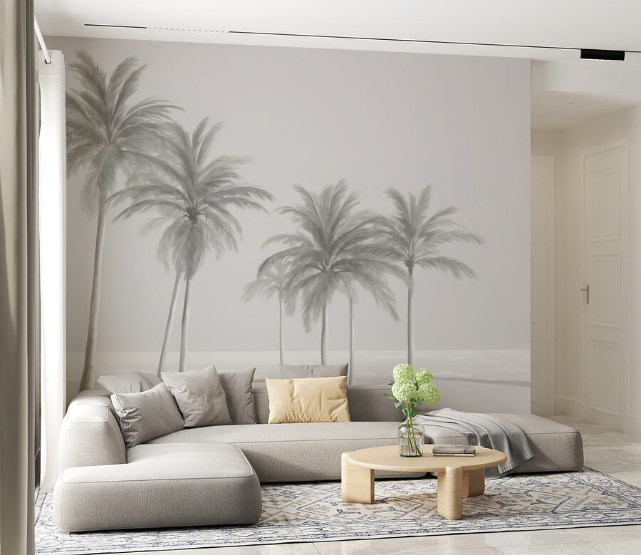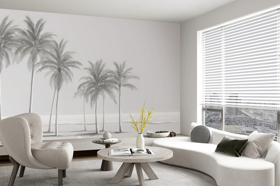 Este mural apresenta uma cena com várias palmeiras altas e elegantes balançando suavemente como se tocadas por uma brisa costeira. As cores suaves e discretas dão-lhe uma sensação quase onírica, um pouco como uma fotografia vintage que capta um dia calmo junto à costa. Encaixa-se perfeitamente em qualquer decoração – moderna, boho, o que quiser. Além disso, é super reconfortante; o tipo de vista que o faz expirar instantaneamente.